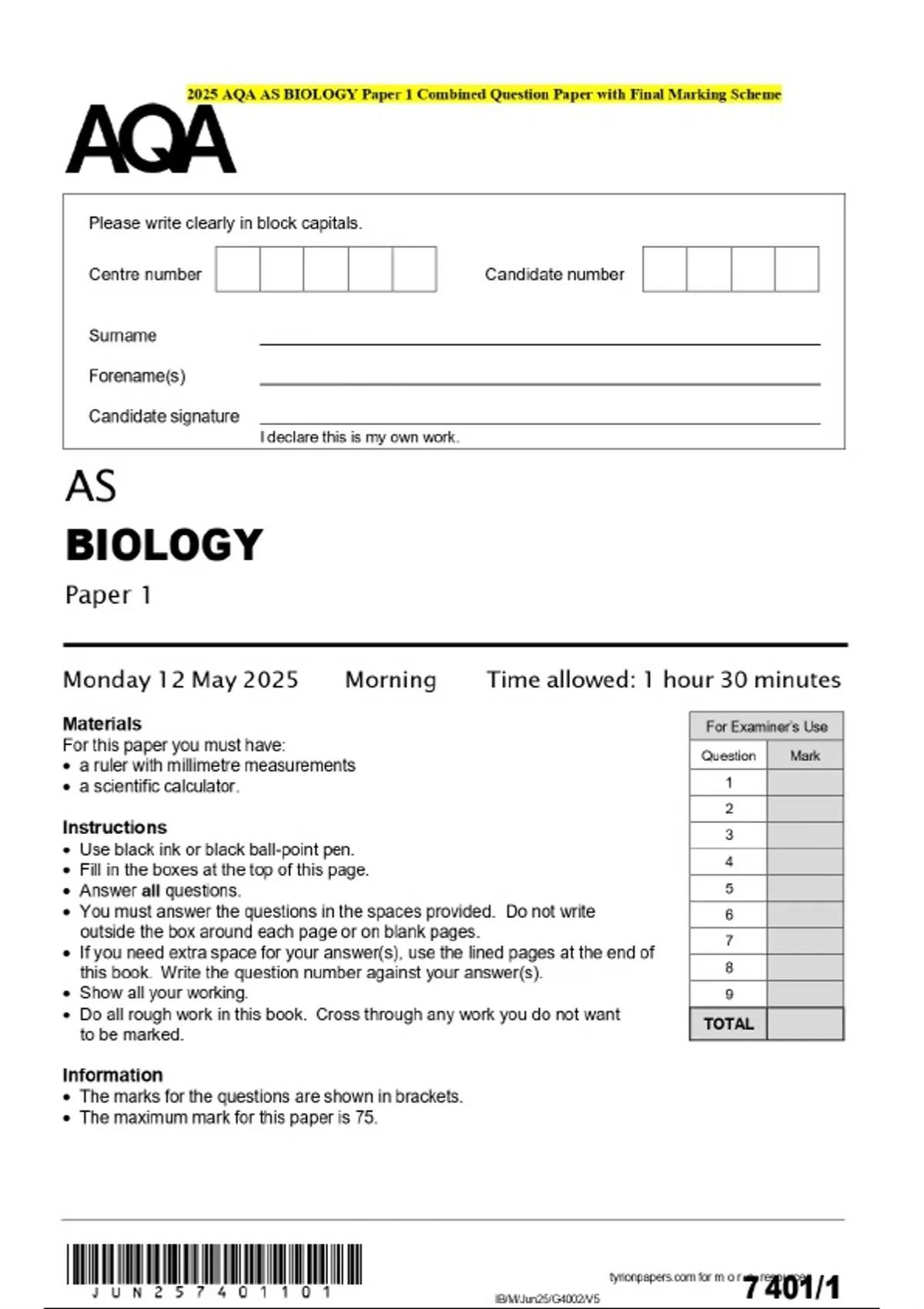2025 AQA AS BIOLOGY Paper 1 Combined Question Paper with Final Marking Scheme