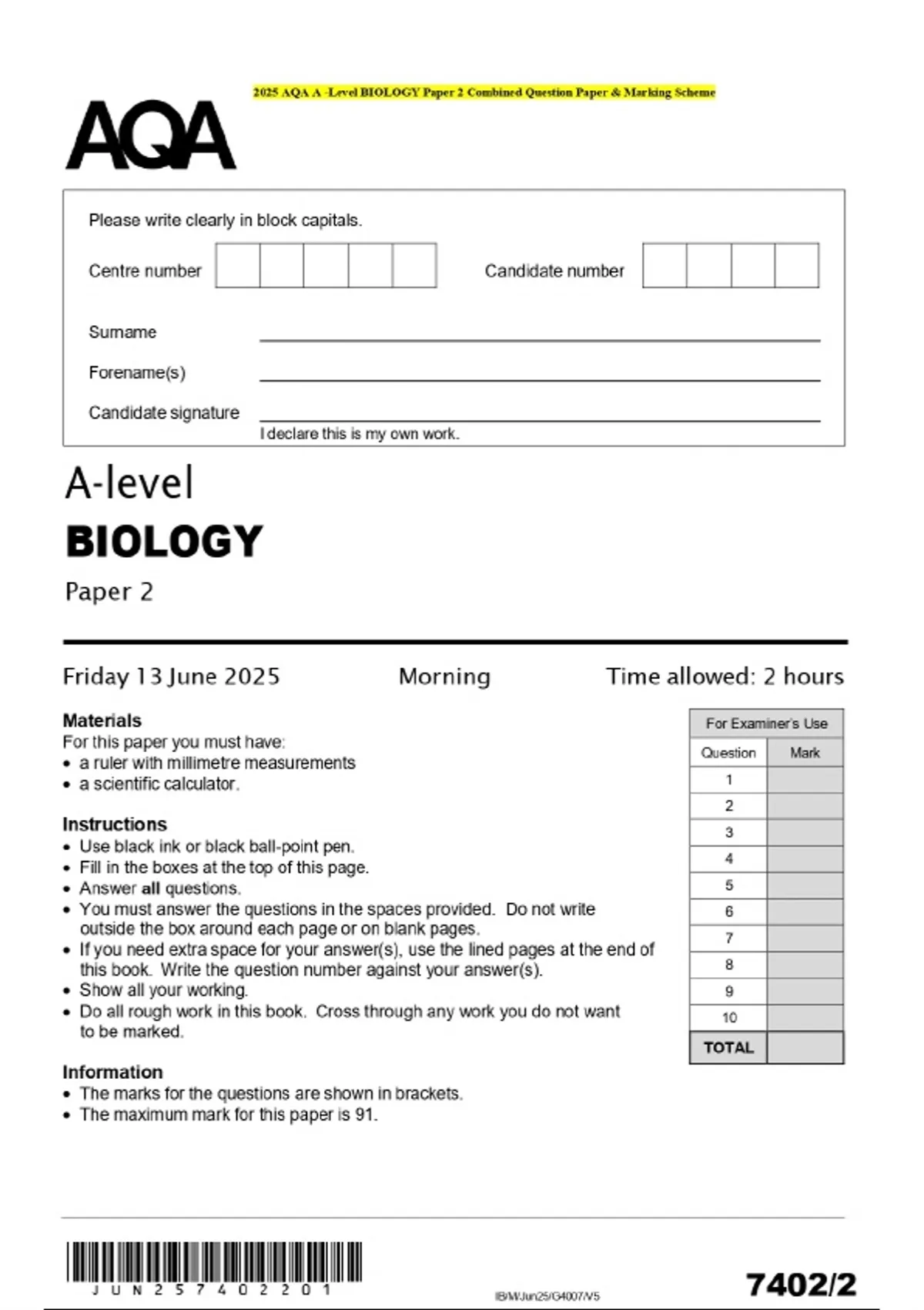 2025 AQA A -Level BIOLOGY Paper 2 Combined Question Paper & Marking Scheme
