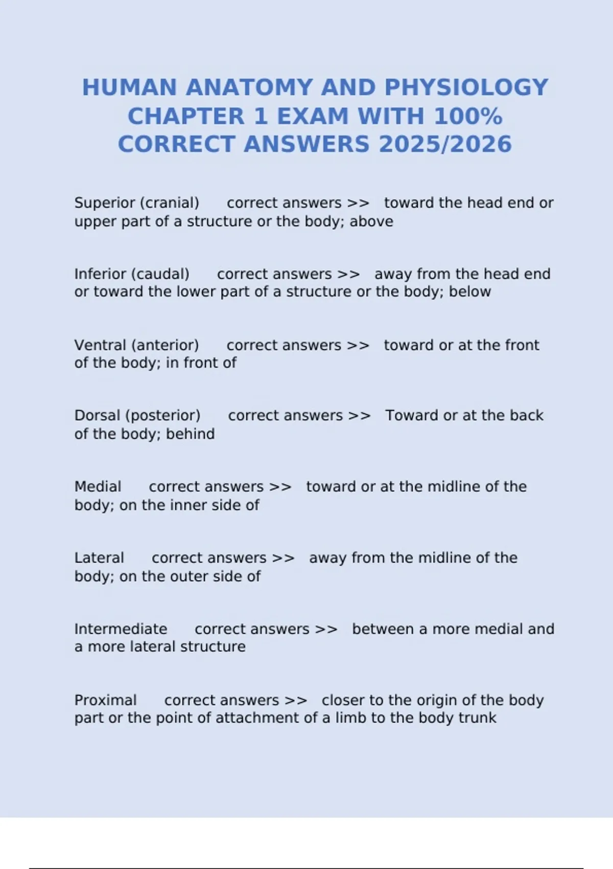 HUMAN ANATOMY AND PHYSIOLOGY CHAPTER 1 EXAM WITH 100% CORRECT ANSWERS 2025/2026 Superior (cranial) correct answers >> toward the head end or upper part of a structure or the body; above Inferior (caudal) correct answers >> away from the head end or toward the lower part of a structure or the body; below Ventral (anterior) correct answers >> toward or at the front of the body; in front of Dorsal (posterior) correct answers >> Toward or at the back of the body; behind Medial correct answers >> toward or at the midline of the body; on the inner side of Lateral correct answers >> away from the midline of the body; on the outer