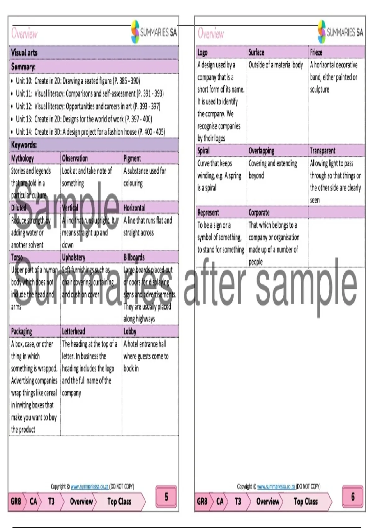 Summary Grade 8 Creative Arts (CA) Summaries Term 3 (Top Class)