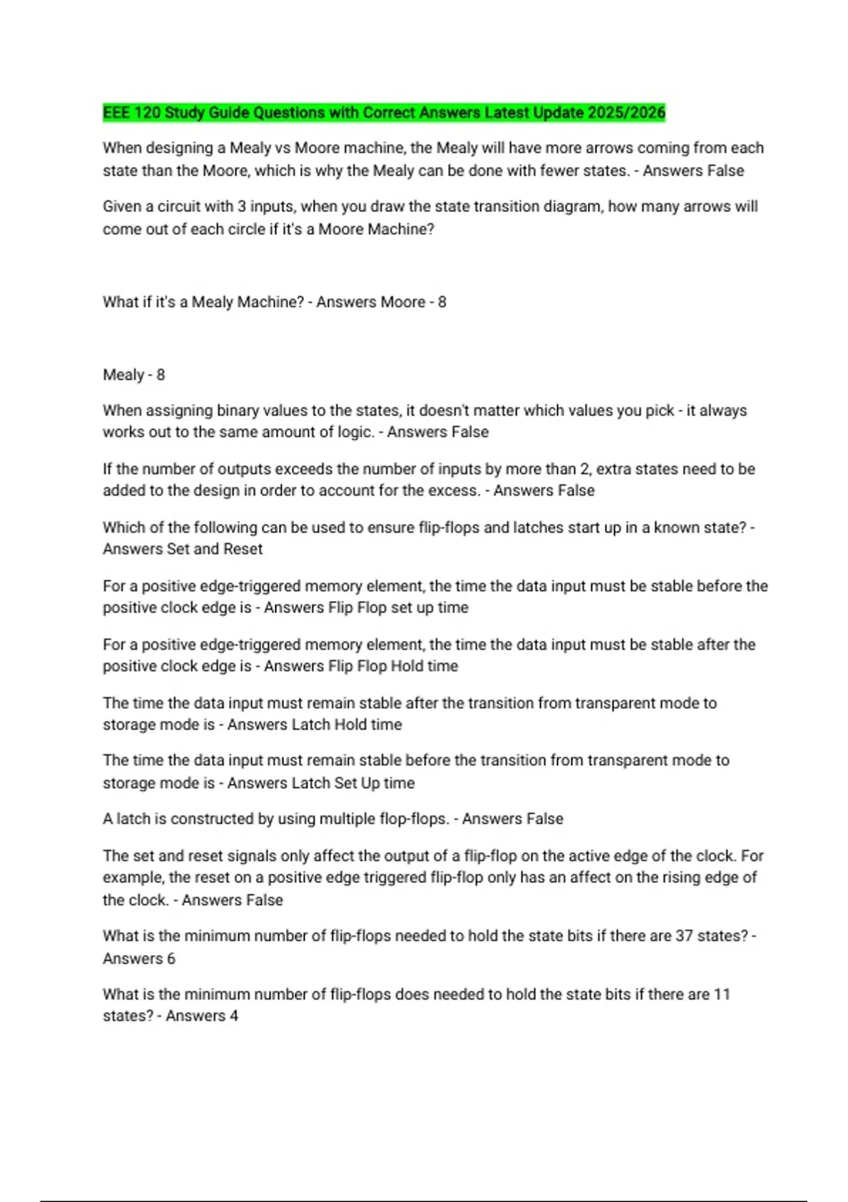 EEE 120 Study Guide Questions with Correct Answers Latest Update 2025/2026 When designing a Mealy vs Moore machine, the Mealy will have more arrows coming from each state than the Moore, which is why the Mealy can be done with fewer states. - Answers False Given a circuit with 3 inputs, when you draw the state transition diagram, how many arrows will come out of each circle if it's a Moore Machine? What if it's a Mealy Machine? - Answers Moore - 8 Mealy - 8 When assigning binary values to the states, it doesn't matter which values you pick - it always works out to the same amount of logic. - Answers False If the number of outputs exceeds the number of inputs by more than 2, extra states need to be added to the design in order to account for the excess. - Answers False Which of the following can be used to ensure flip-flops and latches start up in a known state? - Answers Set and Reset For a positive edge-triggered memory element, the time the data input must be stable before the positive clock edge is - Answers Flip Flop set up time For a positive edge-triggered memory element, the time the data input must be stable after the positive clock edge is - Answers Flip Flop Hold time The time the data input must remain stable after the transition from transparent mode to storage mode is - Answers Latch Hold time The time the data input must remain stable before the transition from transparent mode to storage mode is - Answers Latch Set Up time A latch is constructed by using multiple flop-flops. - Answers False