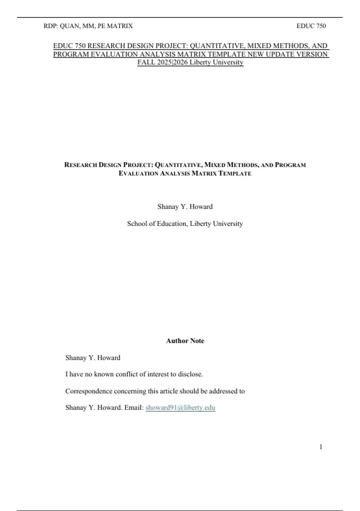 EDUC 750 RESEARCH DESIGN PROJECT: QUANTITATIVE, MIXED METHODS, AND PROGRAM EVALUATION ANALYSIS MATRIX TEMPLATE NEW UPDATE VERSION FALL 2025|2026 Liberty University