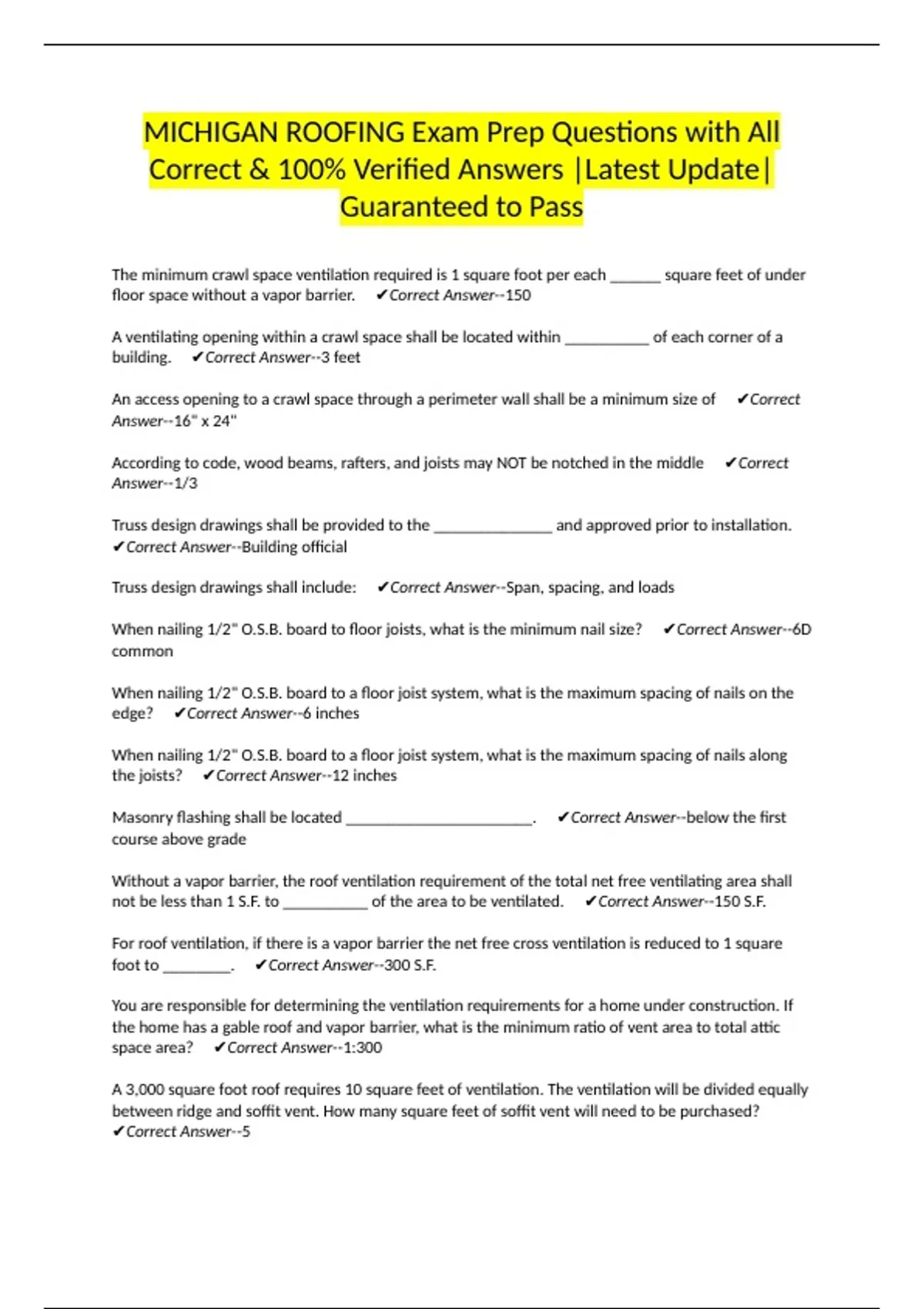 not be less than 1 S.F. to __________ of the area to be ventilated. ✔Correct Answer--150 S.F.