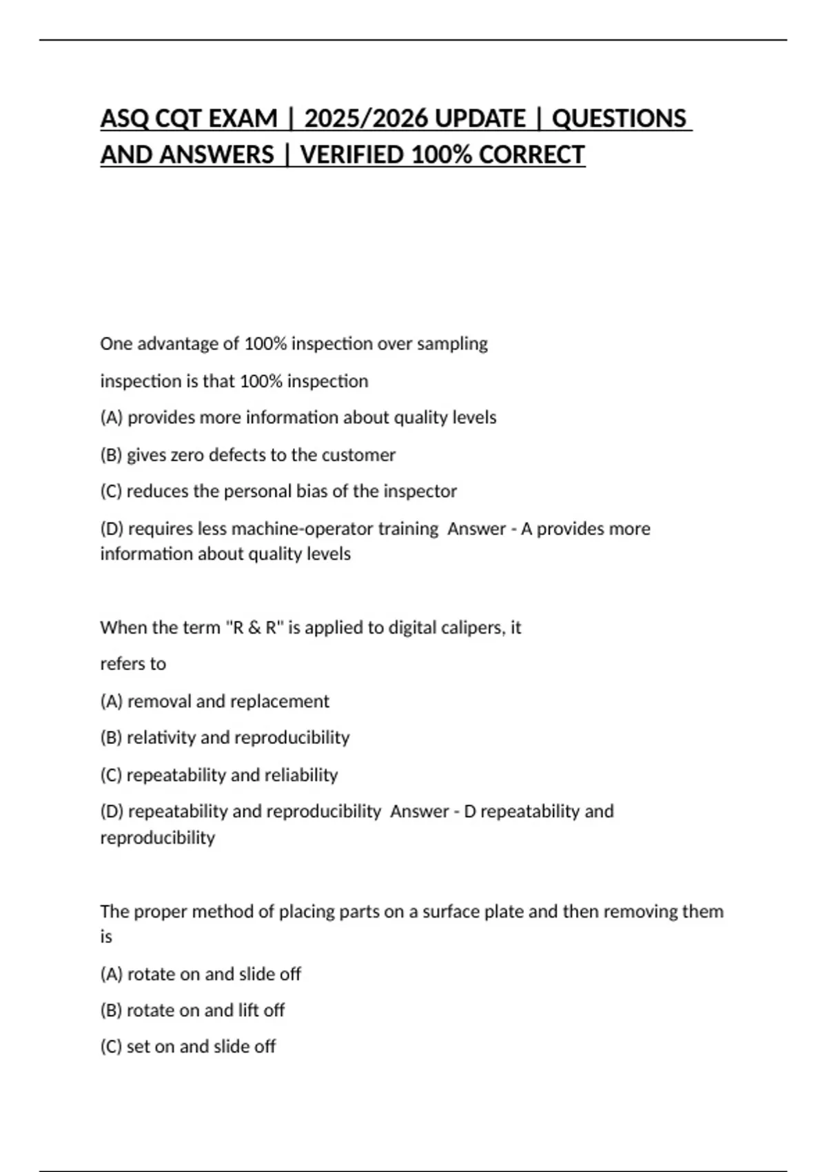 ASQ CQT EXAM | 2025/2026 UPDATE | QUESTIONS AND ANSWERS | VERIFIED 100% CORRECT