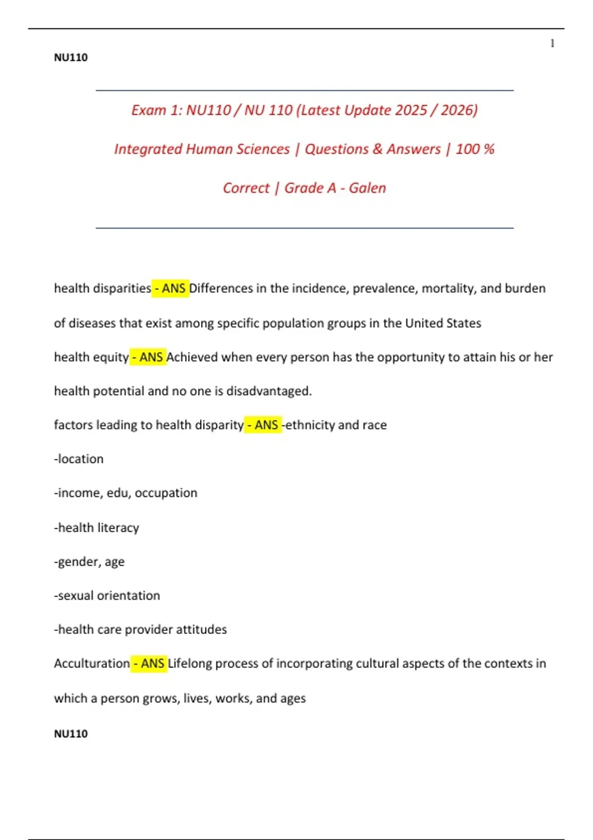 Exam 1: NU110 / NU 110 (Latest Update )