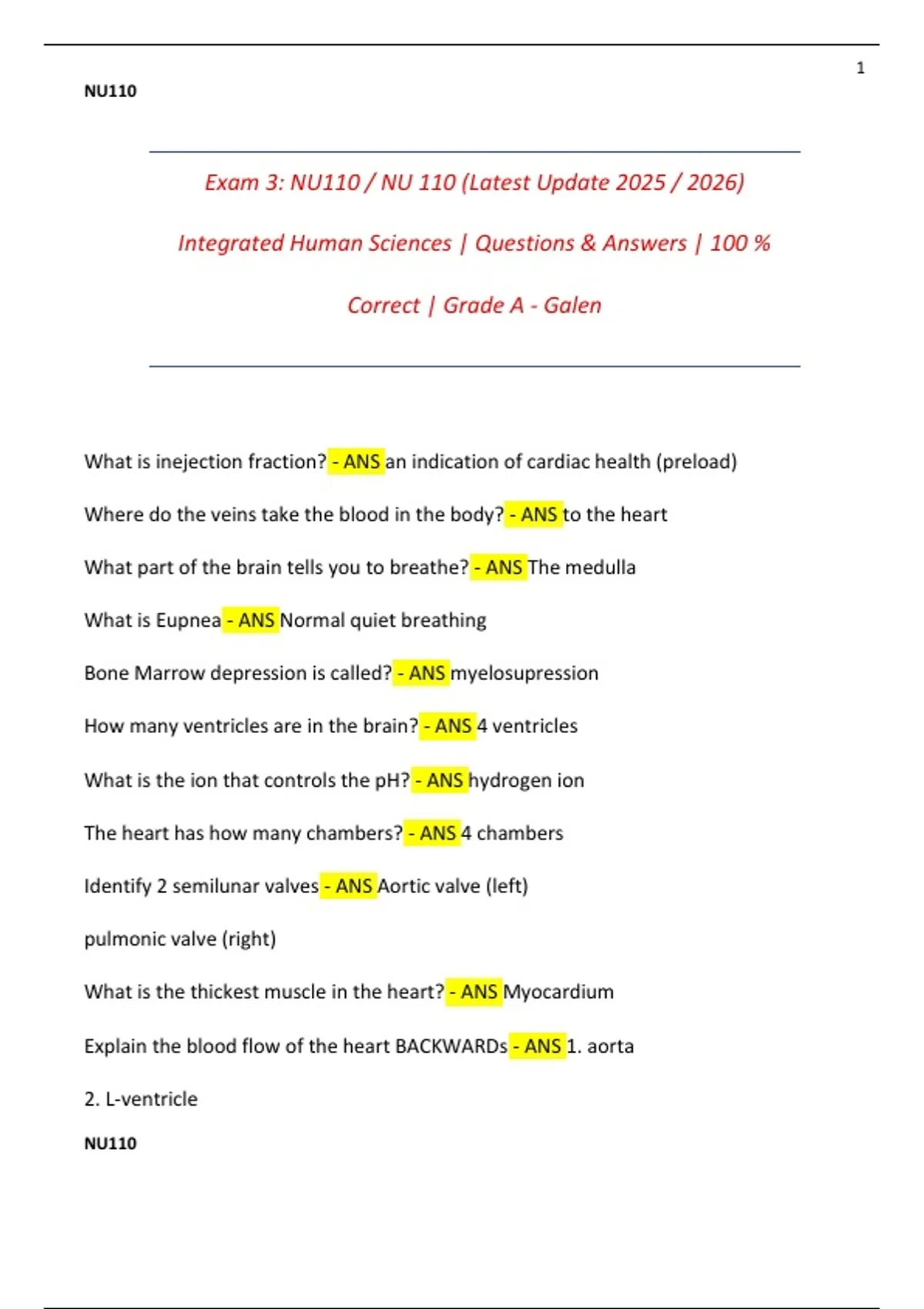 This document contains the complete set of Exam 3 questions and answers for NU110 / NU 110 Integrated Human Sciences at Galen College. It covers all major topics assessed in the third exam and includes fully verified, 100% correct answers aligned with the latest 2025–2026 curriculum. Designed for effective revision and exam readiness, this resource has achieved a Grade A and accurately reflects the structure and difficulty of the actual NU110 Exam 3.