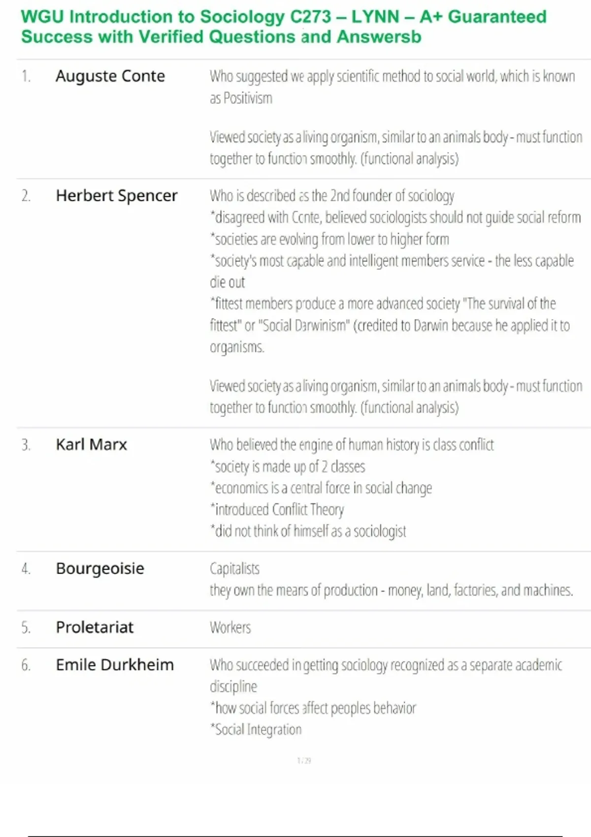 This WGU Introduction to Sociology C273 study guide is designed to help students understand foundational sociological concepts and theories. It includes verified questions and clearly explained answers covering culture, socialization, social structures, groups, institutions, inequality, deviance, social change, and sociological research methods. Carefully aligned with WGU C273 course competencies, this guide supports focused study and exam readiness. Ideal for learners seeking a clear and practical understanding of society, it strengthens analytical thinking and provides a reliable pathway to guaranteed success and A+-level performance.
