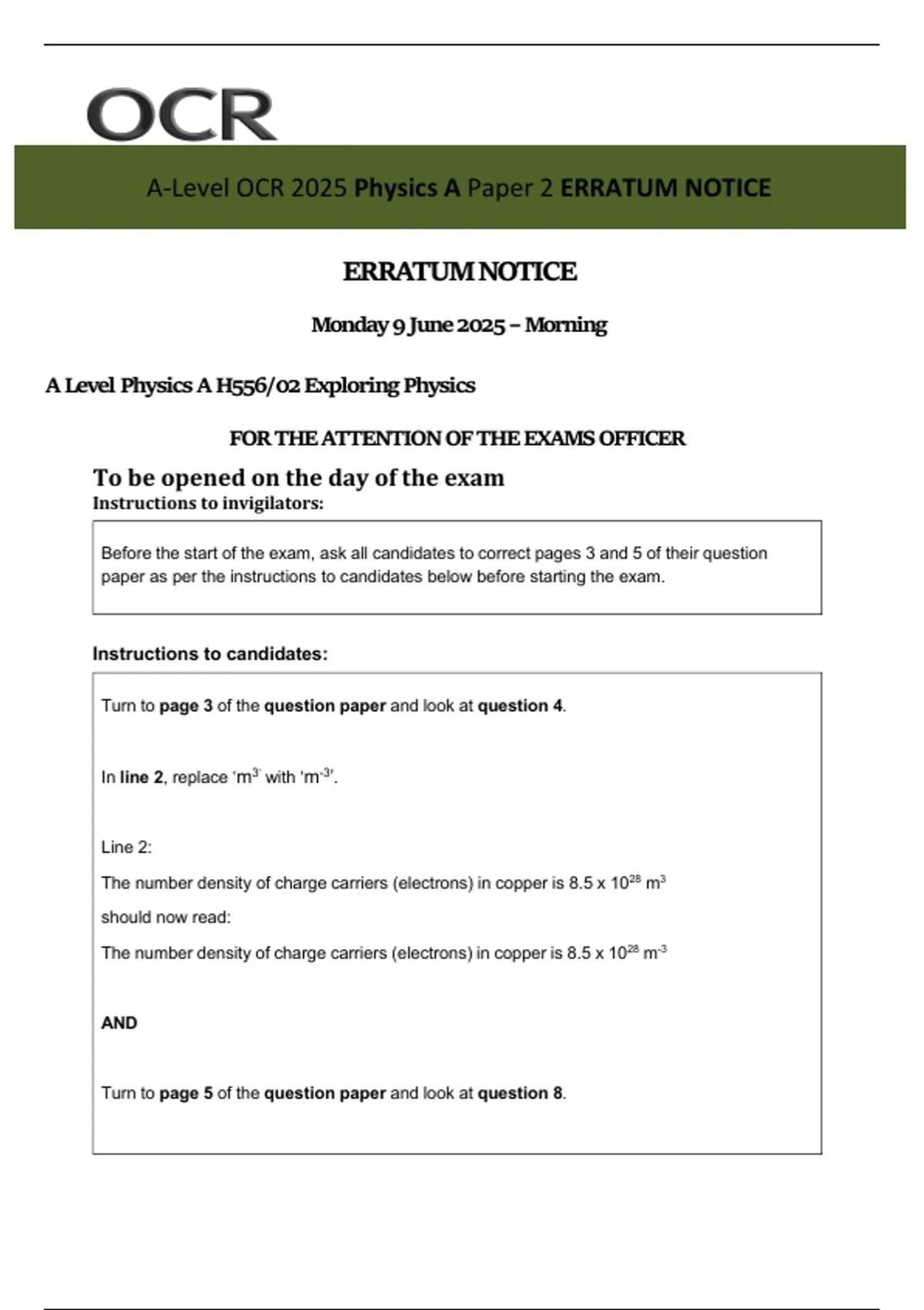 A-Level OCR 2025 Physics A Paper 2 ERRATUM NOTICE
