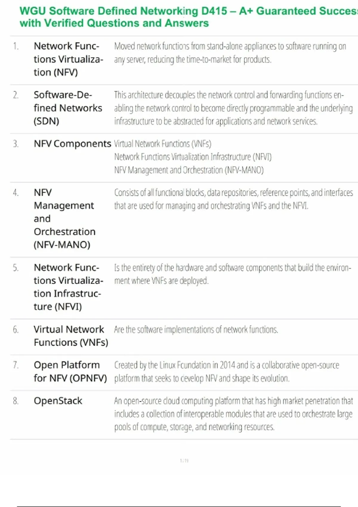 This WGU Software Defined Networking D415 study guide is designed to help students master the principles and practical applications of SDN technology. It includes verified questions and clearly explained answers covering network virtualization, controller architectures, SDN protocols, flow management, network programmability, security considerations, and real-world deployment scenarios. Carefully aligned with WGU D415 course competencies, this guide supports focused study and exam readiness. Ideal for networking and IT learners, it simplifies complex concepts and provides a reliable pathway to guaranteed success and A+-level performance.