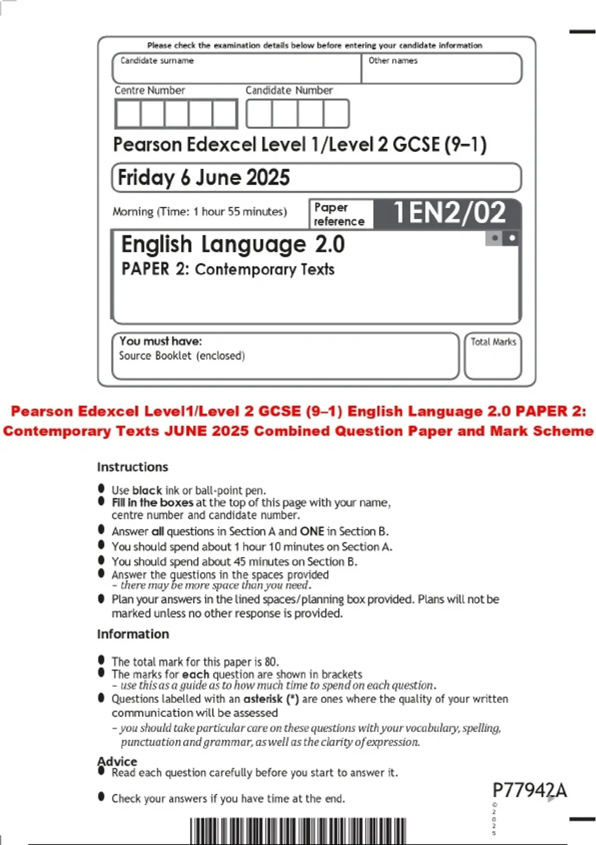 Pearson Edexcel Level1/Level 2 GCSE (9–1) English Language 2.0 PAPER 2: Contemporary Texts JUNE 2025 Combined Question Paper and Mark Scheme