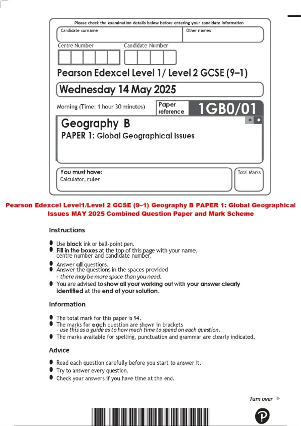 Pearson Edexcel Level1/Level 2 GCSE (9–1) Geography B PAPER 1: Global Geographical Issues MAY 2025 Combined Question Paper and Mark Scheme