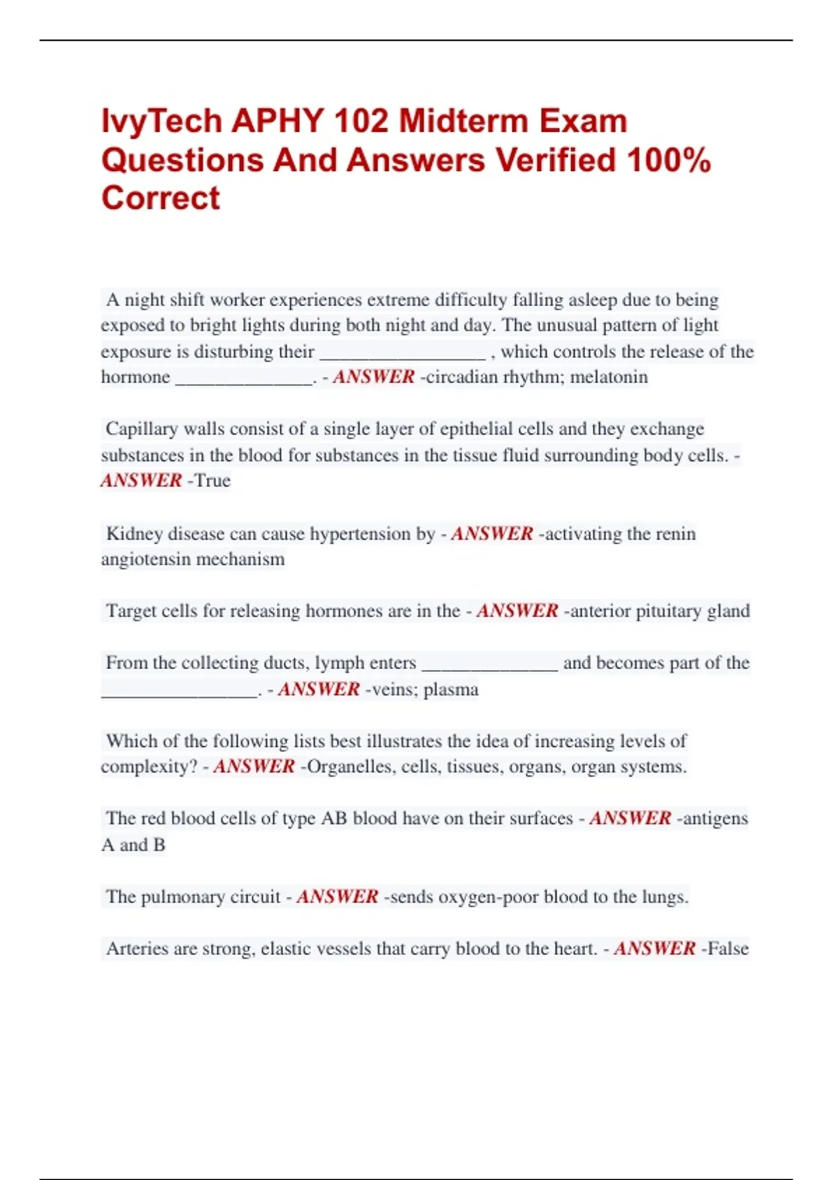 IvyTech APHY 102 Midterm Exam Questions And Answers Verified 100% Correct A night shift worker experiences extreme difficulty falling asleep due to being exposed to bright lights during both night and day. The unusual pattern of light exposure is disturbing their _________________ , which controls the release of the hormone ______________. - ANSWER -circadian rhythm; melatonin Capillary walls consist of a single layer of epithelial cells and they exchange substances in the blood for substances in the tissue fluid surrounding body cells. - ANSWER -True Kidney disease can cause hypertension by - ANSWER -activating the renin angiotensin mechanism Target cells for releasing hormones are in the - ANSWER -anterior pituitary gland From the collecting ducts, lymph enters ______________ and becomes part of the ________________. - ANSWER -veins; plasma Which of the following lists best illustrates the idea of increasing levels of complexity? - ANSWER -Organelles, cells, tissues, organs, organ systems. The red blood cells of type AB blood have on their surfaces - ANSWER -antigens A and B The pulmonary circuit - ANSWER -sends oxygen-poor blood to the lungs. Arteries are strong, elastic vessels that carry blood to the heart. - ANSWER -False Which of the following has both endocrine and exocrine functions? - ANSWER pancreas doctors suggest that during long periods of sitting, you should flex and extend your feet at the ankles periodically and squeeze your calf muscles to assist with blood circulation. Why would non-exercise muscle contraction affect blood flow and cardiovascular health? - ANSWER -Contraction of the leg muscles squeezes leg veins, which functions as a pumping mechanism to return deoxygenated blood to the heart. which of the following illustrates a positive feedback mechanism? - ANSWER Uterine contractions during childbirth. Hematocrit is - ANSWER -the percentage of red blood cells in a blood sample. A red blood cell contains a large nucleus; it is thicker near the center and thin around the rim of the cell. - ANSWER -False which of the following is NOT an example of a negative homeostatic mechanism in the human body? - ANSWER -Retention of fluid leading to retention of more fluid. The removal of wastes produced by metabolic reactions is - ANSWER -excretion Circulation is vital because it - ANSWER -supplies oxygen and nutrients to and removes wastes from tissues. Innate defenses include mechanical and chemical barriers, whereas adaptive defenses counter specific disease-causing agents. - ANSWER -True Lymphatic capillaries are thin-walled, closed-ended tubes - ANSWER -True What are pathogens - ANSWER -disease causing agents Erythroblastosis fetalis may occur in - ANSWER -A. a second Rh-positive fetus developing in an Rh-negative woman. When a person's pulse is taken by palpation near the thumb on the wrist, which artery is felt? - ANSWER -Radial artery Which of the following layers of the heart and their functions are correctly matched? - ANSWER -Myocardium-cardiac muscle tissue that pumps blood out of the heart chambers. Cardiac output is calculated by multiplying the stroke volume by the systolic blood pressure. - ANSWER -True The celiac artery provides blood to the - ANSWER -liver and spleen The blood pressure in the large systemic arteries is greatest during... - ANSWER ventricular systole The correct sequence of parts that carry cardiac impulses is - ANSWER -SA node, AV node, AV bundle, Purkinje fibers Which of the following correctly matches the valve to its function? - ANSWER Mitral valve-permits one-way blood flow from the left atrium to the left ventricle. Positive feedback mechanisms... - ANSWER -move conditions away from the normal state atrial natriuretic peptide is a hormone that - ANSWER -inhibits the release of renin and aldosterone Which of the following is the correct sequence of parts through which blood moves from the vena cava to the lungs? - ANSWER -Right atrium, tricuspid valve, right ventricle, pulmonary valve