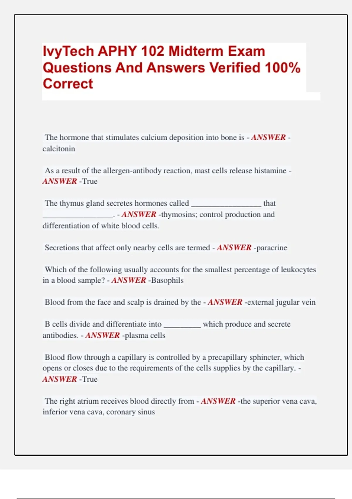 IvyTech APHY 102 Midterm Exam Questions And Answers Verified 100% Correct The hormone that stimulates calcium deposition into bone is - ANSWER calcitonin As a result of the allergen-antibody reaction, mast cells release histamine - ANSWER -True The thymus gland secretes hormones called _________________ that _________________. - ANSWER -thymosins; control production and differentiation of white blood cells. Secretions that affect only nearby cells are termed - ANSWER -paracrine Which of the following usually accounts for the smallest percentage of leukocytes in a blood sample? - ANSWER -Basophils Blood from the face and scalp is drained by the - ANSWER -external jugular vein B cells divide and differentiate into _________ which produce and secrete antibodies. - ANSWER -plasma cells Blood flow through a capillary is controlled by a precapillary sphincter, which opens or closes due to the requirements of the cells supplies by the capillary. - ANSWER -True The right atrium receives blood directly from - ANSWER -the superior vena cava, inferior vena cava, coronary sinus The loose-fitting sac around the heart is the - ANSWER -fibrous pericardium A hormone that the adrenal medulla secretes is - ANSWER -epinephrine Which of the following are agranulocytes? - ANSWER -monocytes A hormone is a secreted molecule that is carried in the bloodstream to where it acts on target cells that bear specific receptors for that hormone. - ANSWER -True The normal pacemaker of the heart is the - ANSWER -sinoatrial node The spleen - ANSWER -resembles a large lymph node divided into lobules. In all organisms, the basic unit of structure and function is - ANSWER -the cell Which type of blood vessel holds the greatest volume of blood? - ANSWER -Vein T lymphocytes are responsible for - ANSWER -cell-mediated immunity Persons with type AB blood are sometimes called universal donors. - ANSWER False Anatomy and physiology are difficult to separate because - ANSWER physiological functions depend on anatomical structures. compared to the nervous system, the endocrine system - ANSWER -may have a longer lasting effect A hormone is a _______________ and the target cell is_______________________. - ANSWER -molecule that has a metabolic effect on another cell; a cell that has receptors for specific hormones. In an ECG pattern, the P wave is caused by - ANSWER -depolarization of atrial muscle fibers. The great saphenous vein is the longest vein in the body. - ANSWER -True The type of resistance that is acquired as a result of developing a disease is... - ANSWER -naturally acquired active immunity. Kidneys are part of the lymphatic system - ANSWER -False While looking at a sample of blood in a microscope, you see a cell that is markedly larger than a red blood cell. It has a bi-lobed nucleus and is filled with red granules in the cytoplasm. What type of blood cell is this? - ANSWER -An eosinophil Which of the following characteristics of life and their descriptions is correct? - ANSWER -circulation- the movement of substances in body fluids A primary immune response _____________ , and a secondary immune response __________________. - ANSWER -produces antibodies within five to ten days of exposure to antigens; produces antibodies within a day or two of a subsequent exposure to the same antigen. Which artery is incorrectly matched to its location? - ANSWER -Thyrocervical arteries; Thymus The lymph nodes of the axillary region receive lymph mainly from the - ANSWER -upper limb and mammary gland The basic event in the formation of a blood clot is the change of... - ANSWER fibrinogen to fibrin Drugs used to reduce the tissue rejection reaction following the transplantation of tissue from one person to another - ANSWER -suppress the immune response in the recipient