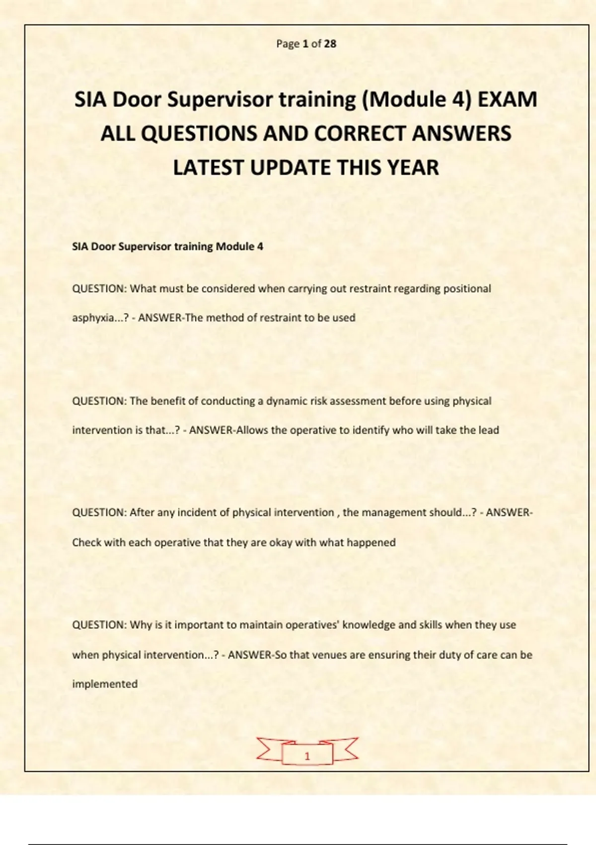 Tap on AVAILABLE IN BUNDLE / PACKAGE DEAL to unlock free bonus exams — save more while getting everything you need! You’ll be glad you did! SIA Door Supervisor Training Module 3 Exam COMPLETE QUESTIONS AND VERIFIED SOLUTIONS 2026–2027 LATEST UPDATE THIS YEAR is a fully updated and focused study resource designed to help aspiring door supervisors confidently pass Module 3 of the SIA exam. This complete guide includes exam-style questions with verified solutions, covering essential topics such as crowd management, conflict resolution, emergency response procedures, communication skills, legal responsibilities, health and safety, and professional standards. Structured for efficient study and practical application, this resource helps reduce exam stress, reinforce critical security knowledge, and ensure you are fully prepared to pass the SIA Door Supervisor Module 3 Exam on your first attempt with confidence.