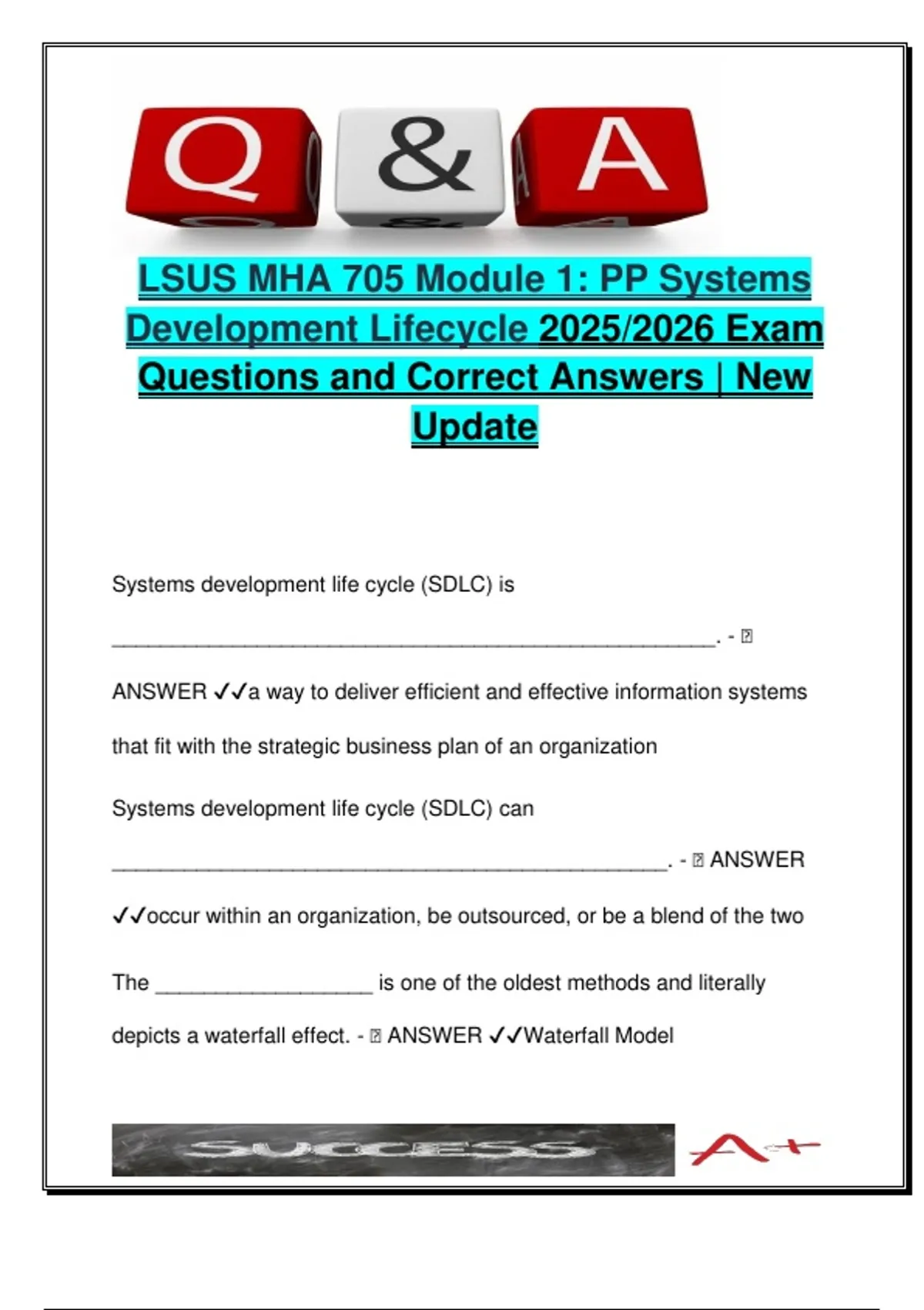 This document contains a complete collection of 30 exam questions with correct answers for Module 1 of the MHA 705: Healthcare Informatics course at Louisiana State University Shreveport (LSUS) for the 2025/2026 academic year. The focus of this module is on the Systems Development Life Cycle (SDLC) and its application in healthcare information systems. It includes comprehensive coverage of various SDLC models such as the Waterfall Model, Rapid Application Development (RAD), Object-Oriented Systems Development (OOSD), and the Dynamic Systems Development Method (DSDM). The material delves into essential concepts like iterative design, interoperability under the HITECH Act, use of Computer-Aided Software Engineering (CASE) tools, the impact of open-source software (OSS), and project management strategies in software system design. Key insights are provided into the phases of system development, including planning, prototyping, user feedback loops, and system optimization. This resource is particularly relevant for students in Master of Healthcare Administration (MHA) programs, as well as those in health information systems, nursing informatics, IT in healthcare, and digital health strategy courses. It is also a valuable reference for healthcare professionals, project managers, and IT specialists involved in healthcare system development or implementation projects. Keywords: SDLC, waterfall model, RAD, OOSD, DSDM, healthcare IT, systems development, iterative process, CASE tools, open source software, interoperability, HITECH Act, software prototyping, project life cycle, health informatics