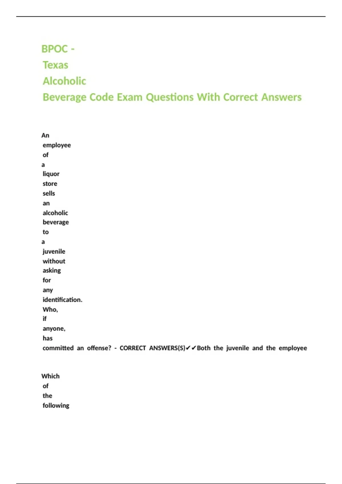 BPOC - Texas Alcoholic Beverage Code Exam Questions With Correct Answers