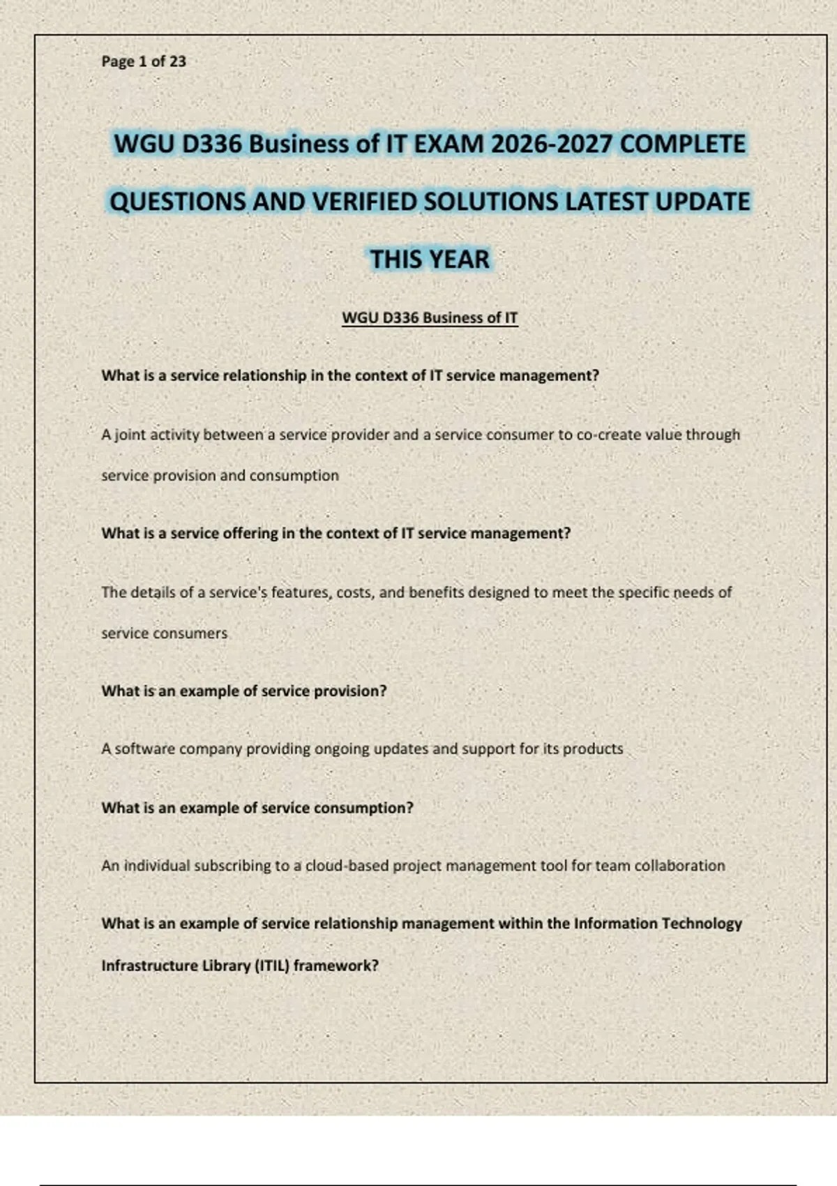 Tap on AVAILABLE IN BUNDLE / PACKAGE DEAL to unlock free bonus exams — save more while getting everything you need! You’ll be glad you did! The WGU D336 Business of IT Exam – Complete Questions and Verified Solutions (Latest Update This Year) delivers a fully updated and comprehensive set of verified questions and solutions designed to help students confidently prepare for the D336 Business of IT assessment. This in-depth study resource covers essential topics including IT business concepts, application development, software lifecycle management, project management, business analysis, technology integration, and IT governance. Each question includes the correct answer and verified solution to reinforce understanding, enhance professional knowledge, and strengthen exam readiness. Ideal for WGU students preparing for the D336 Business of IT Exam, this study guide ensures thorough preparation and confident performance on the assessment.