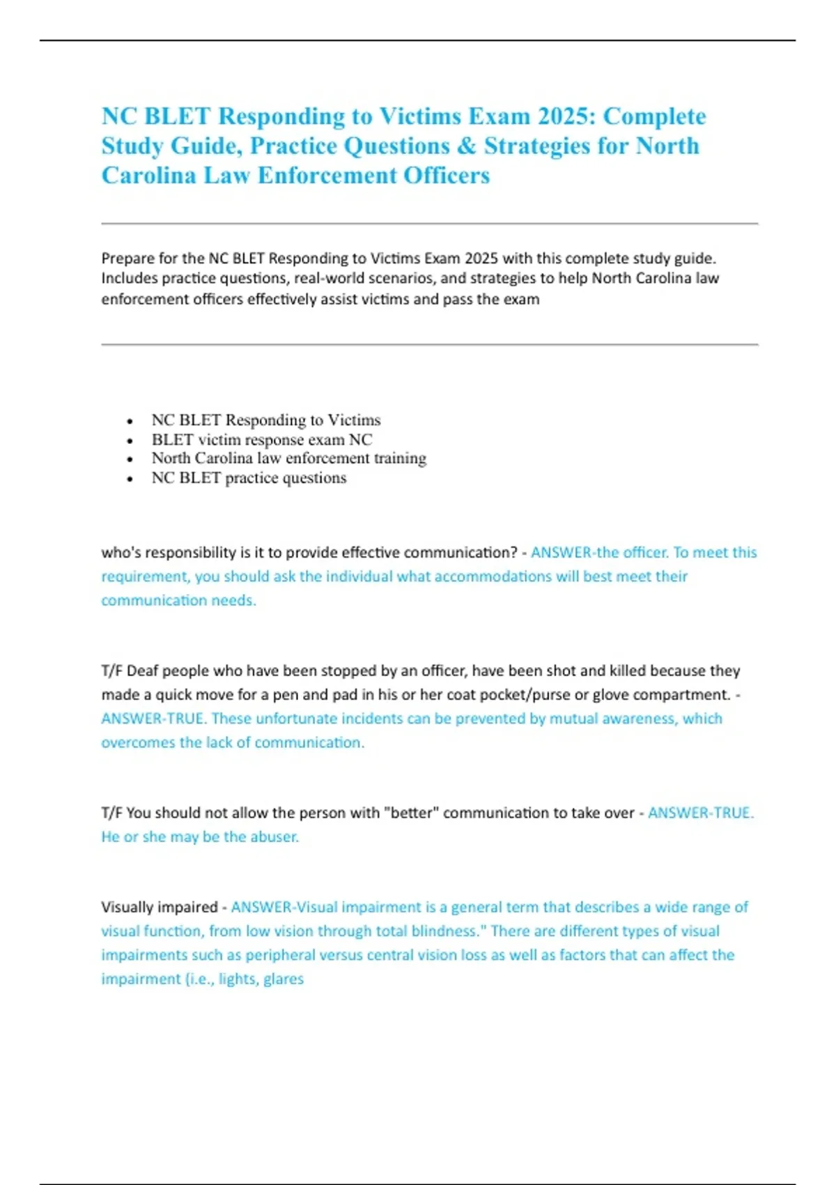 NC BLET Responding to Victims Exam 2025: Complete Study Guide, Practice Questions & Strategies for North Carolina Law Enforcement Officers