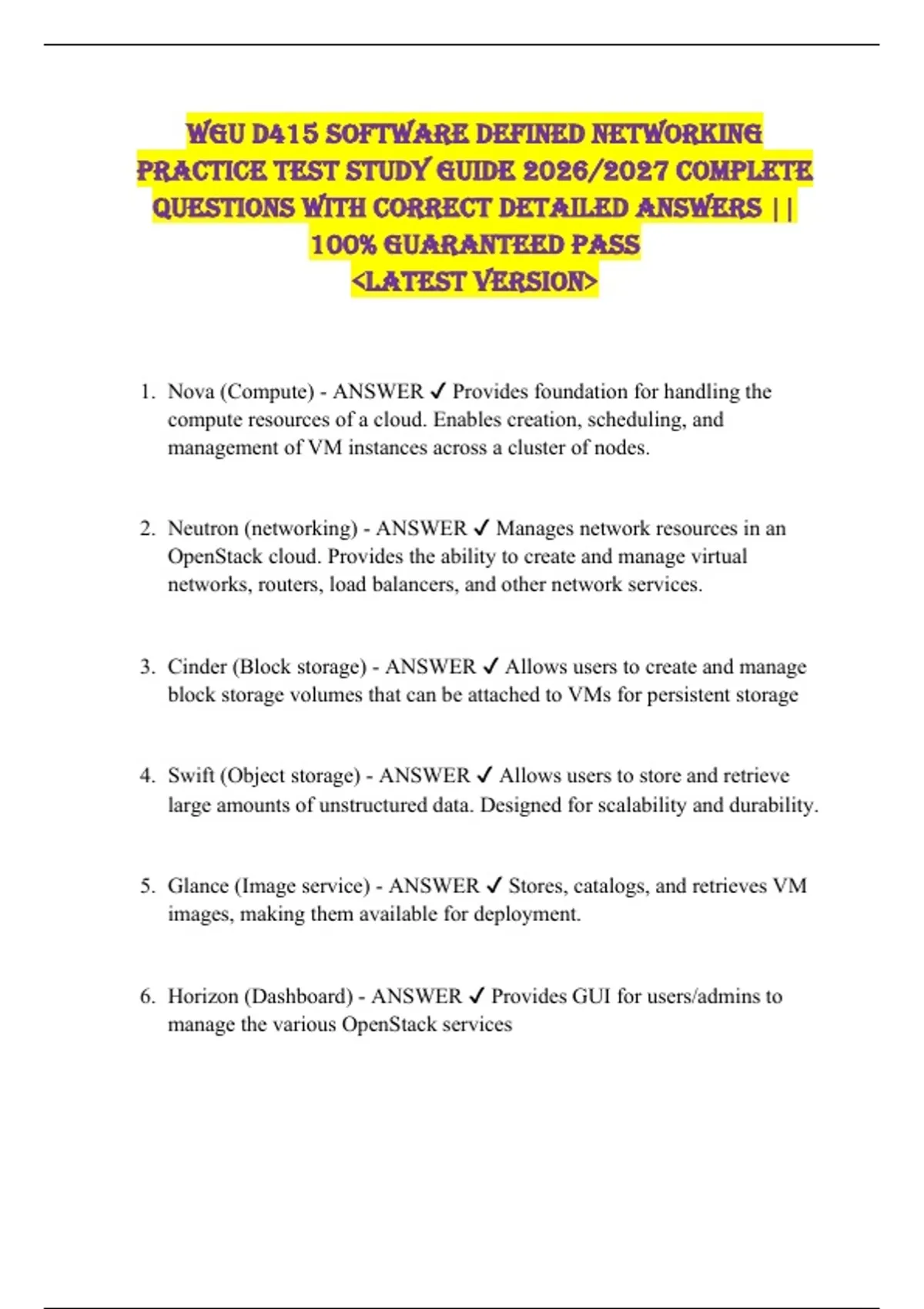 WGU D415 Software Defined Networking Practice TEST STUDY GUIDE 2026/2027 COMPLETE QUESTIONS WITH CORRECT DETAILED ANSWERS || 100% GUARANTEED PASS &lt;LATEST VERSION&gt; 1. Nova (Compute) - ANSWER Provides foundation for handling the compute resources of a cloud. Enables creation, scheduling, and management of VM instances across a cluster of nodes. 2. Neutron (networking) - ANSWER Manages network resources in an OpenStack cloud. Provides the ability to create and manage virtual networks, routers, load balancers, and other network services. 3. Cinder (Block storage) - ANSWER Allows users to create and manage block storage volumes that can be attached to VMs for persistent storage 4. Swift (Object storage) - ANSWER Allows users to store and retrieve large amounts of unstructured data. Designed for scalability and durability. 5. Glance (Image service) - ANSWER Stores, catalogs, and retrieves VM images, making them available for deployment. 6. Horizon (Dashboard) - ANSWER Provides GUI for users/admins to manage the various OpenStack services 7. Keystone (Identity service) - ANSWER IAM service that provides directory of users, roles, and permissions in OpenStack. Offers authentication, token issuance, and access control. 8. NIST SP 800-53 Security Controls - ANSWER Outlines a comprehensive set of security controls across various control families, including access control, configuration management, incident response, and more. 9. NIST SP 800-125B Hypervisor Security - ANSWER Provides guidance on security the hypervisor layer to prevent unauthorized access, ensure isolation between VMs, and protect against various attacks. 10.NIST SP 800-53 Control Families - ANSWER Organized into families, each addressing a specific area of security concern. Ex: Access Control, Audit and Accountability, System and Communications Protection, and Security Assessment and Authorization 11.NIST SP 800-125B Virtualization Components - ANSWER Covers various components such as host systems, guest systems, management interfaces, and virtual networks 12.NIST SP 800-53 Control Baselines - ANSWER Guidelines for tailored security measures based on the organization risk profile and the sensitivity of the information being protected. (low, medium, and high) 13.NIST SP 800-125B Isolation and Segmentation - ANSWER Importance of maintaining strong isolation between VMs to prevent unauthorized information disclosure or unauthorized access. 14.NIST SP 800-53 Continuous Monitoring - ANSWER Monitoring of security controls to ensure ongoing compliance and effectiveness 15.NIST SP 800-125B Configuration Management - ANSWER Emphasizes the need for secure configuration of hypervisor and virtual machine settings, including parameters related to memory allocation, CPU scheduling, and network configurations. 16.Which OSI model layer is responsible for the segment protocol data unit? Network Transport Application Data link - ANSWER Transport 17.Which protocol in the software-defined networking (SDN) framework is responsible for defining the communication between the controller and a network device? OpenFlow Telnet Point-to-point Address resolution - ANSWER OpenFlow 18.Which network automation tool is open source? BlueCat gateway Chef Ansible Puppet Enterprise - ANSWER Ansible 19.What is a benefit of using network automation? Backing up and restoring data Using infrastructure as code to maintain a reliable state Dynamic allocation of IP addresses Boosting storage - ANSWER Using infrastructure as code to maintain a reliable state 20.Which service introduces flexibility, dynamism, and automation into the management of network objects? Open source for network functions virtualization (NFV) OpenStack Network functions virtualization (NFV) Software-defined networking (SDN) - ANSWER Software-defined networking (SDN) 21.Which OpenStack unit provides authentication? Cinder Nova Keystone Neutron - ANSWER Keystone 22.Which interface in SDN allows the controller to communicate, interact, and manage forwarding elements? Westbound