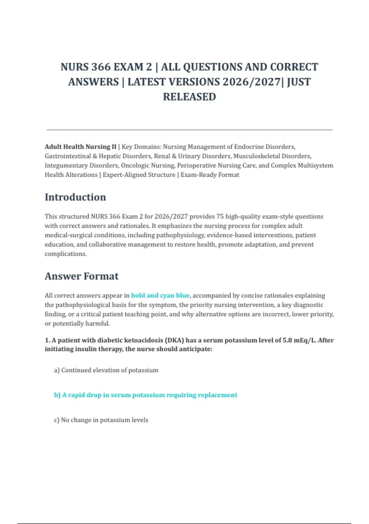 This structured NURS 366 Exam 2 for 2026/2027 provides 75 high-quality exam-style questions