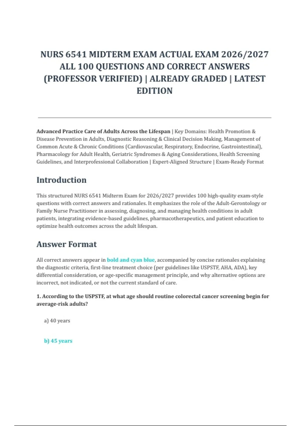 This structured NURS 6541 Midterm Exam for 2026/2027 provides 100 high-quality exam-style