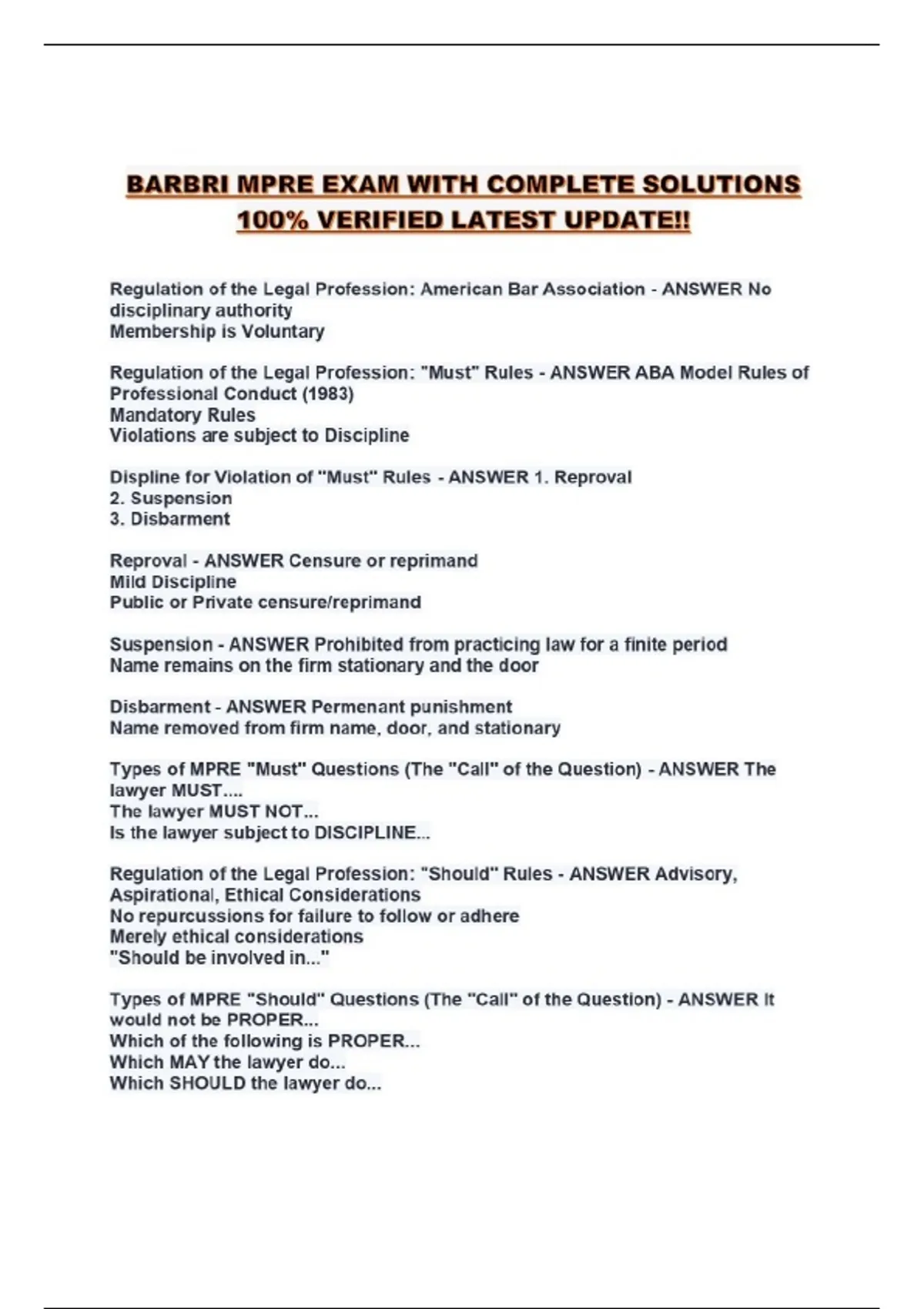 BARBRI MPRE EXAM WITH COMPLETE SOLUTIONS 100% VERIFIED LATEST UPDATE!!...