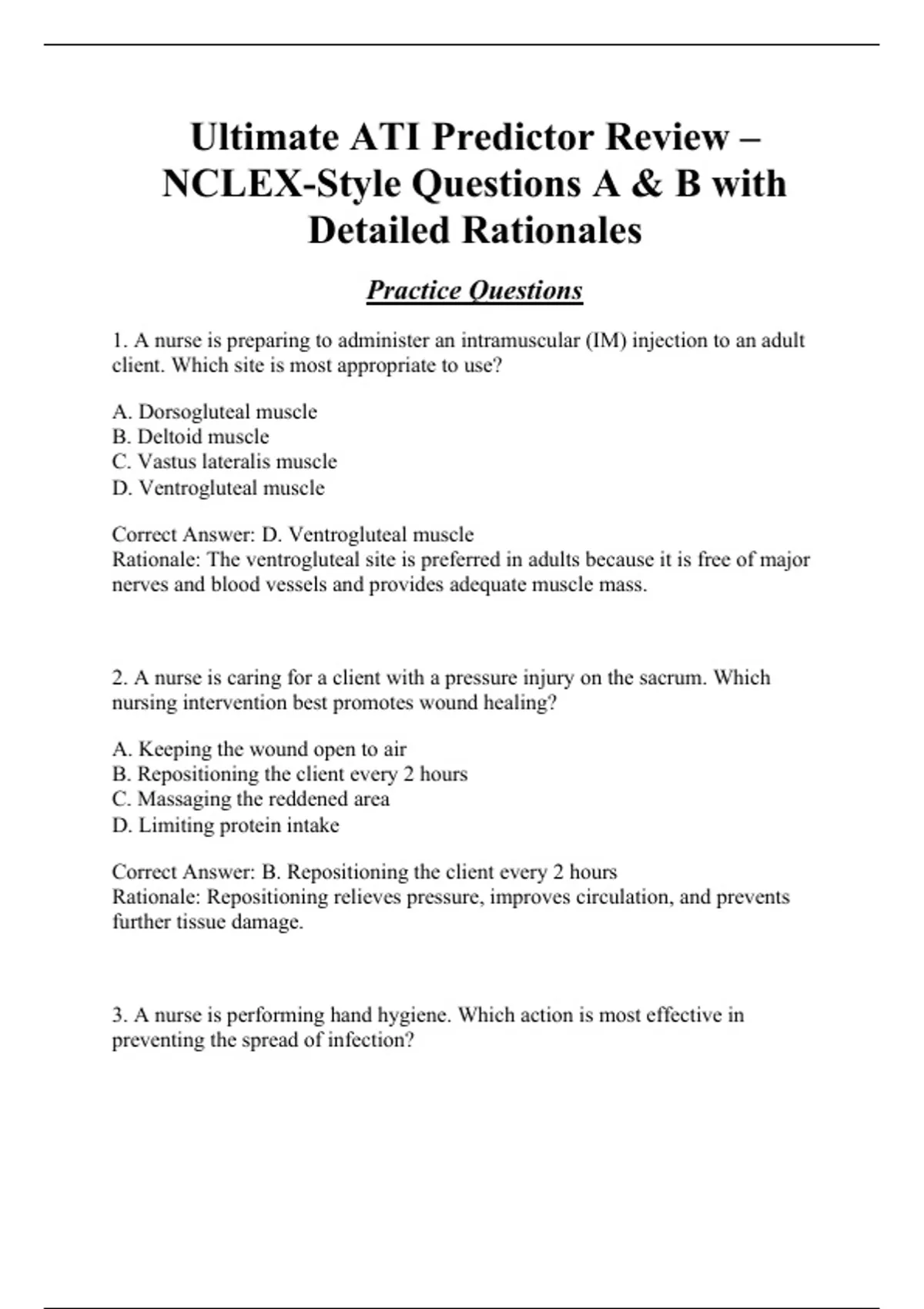 1. A nurse is preparing to administer an intramuscular (IM) injection to an adult