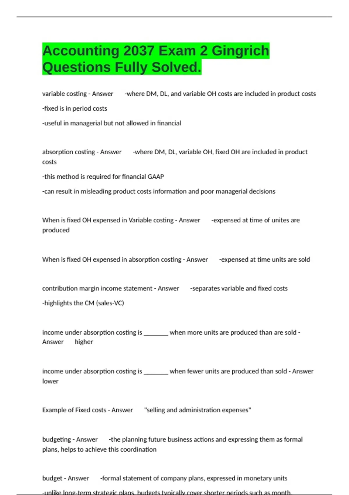 When is fixed OH expensed in Variable costing - Answer -expensed at time of unites are
