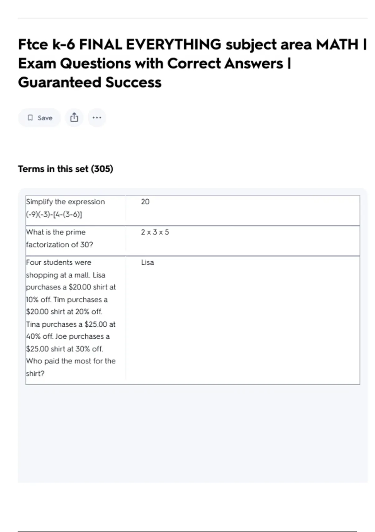 Ftce k-6 FINAL EVERYTHING subject area MATH | Exam Questions with Correct Answers | Guaranteed Success