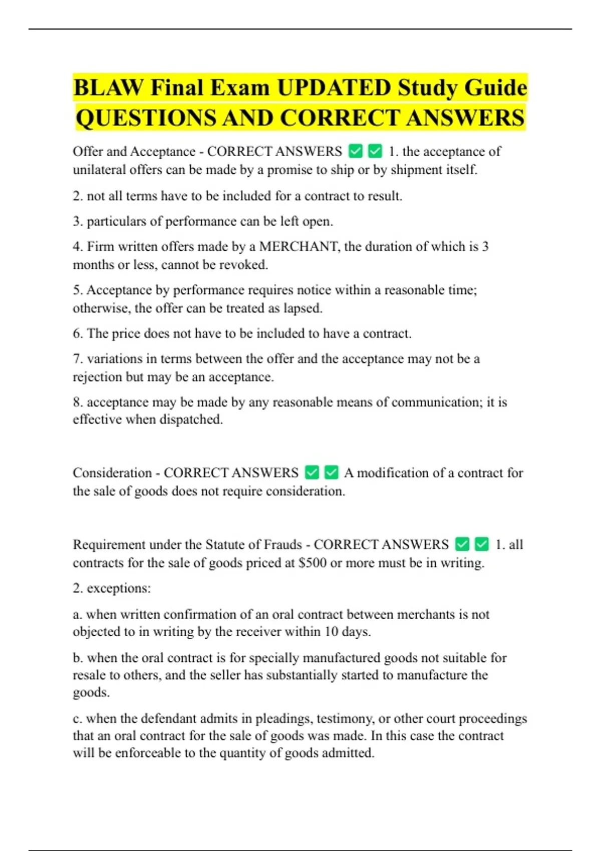 BLAW Final Exam UPDATED Study Guide QUESTIONS AND CORRECT ANSWERS Offer and Acceptance - CORRECT ANSWERS 1. the acceptance of unilateral offers can be made by a promise to ship or by shipment itself. 2. not all terms have to be included for a contract to result. 3. particulars of performance can be left open.