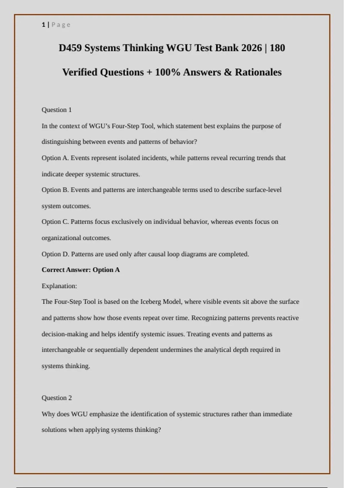 Prepare for WGU D459 – Systems Thinking with this complete 180-question test bank for 2026. Each question includes multiple-choice options, correct answers, and detailed rationales to help students fully understand system structures, feedback loops, and complex dynamics. Ideal for exam preparation, this test bank serves as a comprehensive study guide for mastering key concepts, improving retention, and building confidence. Whether you are reviewing for practice exams, reinforcing learning, or seeking a structured approach to WGU D459, this resource offers targeted support to excel on the Systems Thinking exam. Perfect for serious WGU students.