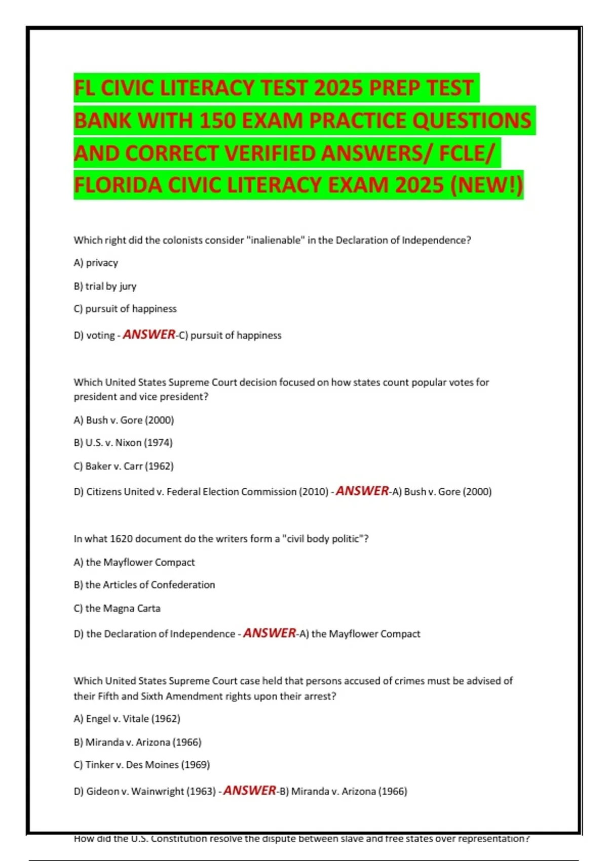 This Florida Civic Literacy Exam (FCLE) 2025 Prep Test Bank is designed for students enrolled in Florida public colleges and universities who must pass the Civic Literacy graduation requirement. The test bank includes 150 carefully structured exam-style questions that reflect the new FCLE format, helping students master the most frequently tested concepts in US government, constitutional principles, federalism, and civic responsibility. What’s Included: • 150 exam-style multiple-choice questions • Coverage of the U.S. Constitution & Bill of Rights • Federal, state & local government structures • Landmark Supreme Court cases • Civic participation & democratic principles Correct, verified answers for fast review Ideal for first-time test takers and retakes Aligned with 2025 FCLE testing standards Perfect for final prep and confidence building A reliable, high-yield resource to help you pass the FCLE on the first attempt.