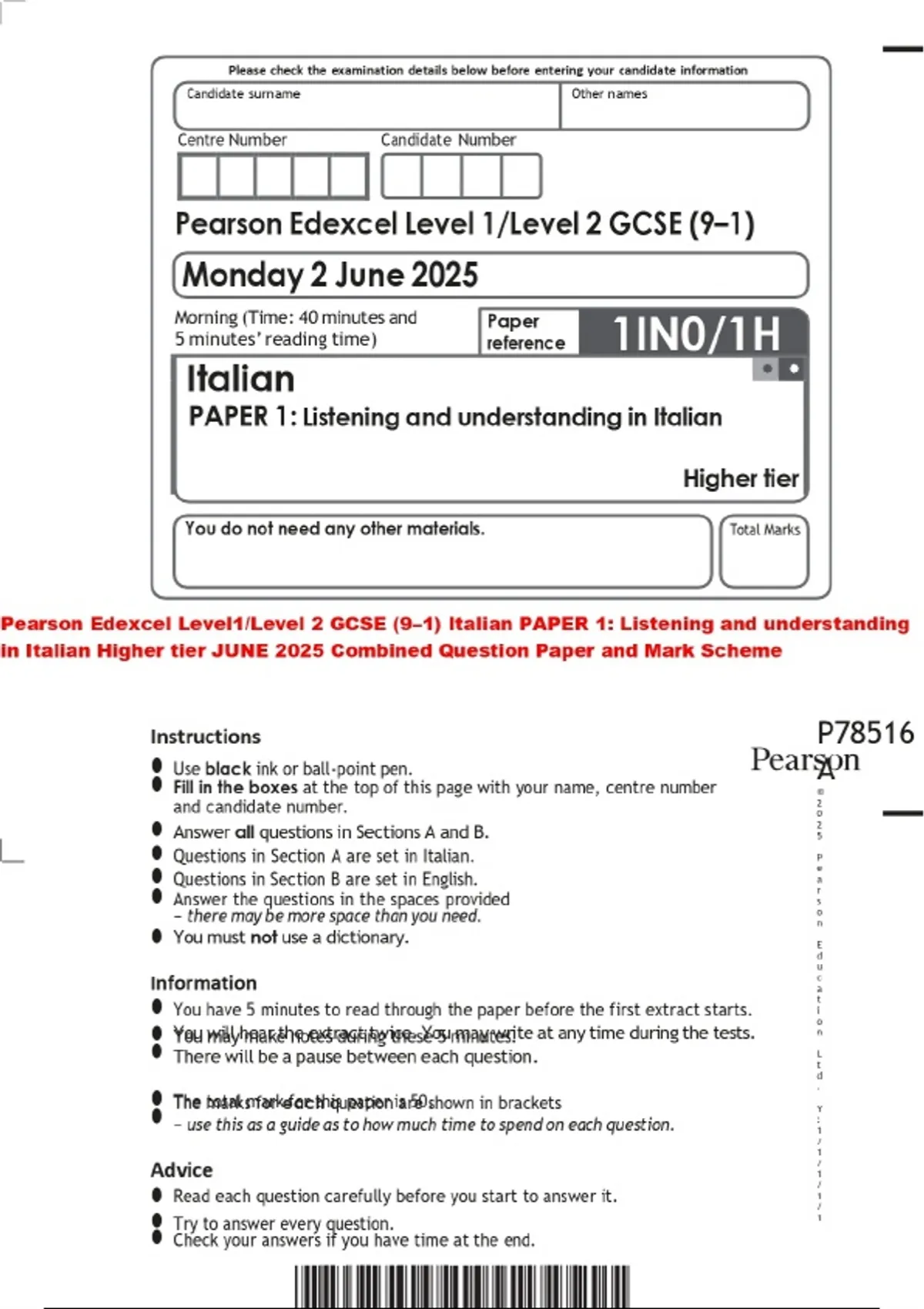 Pearson Edexcel Level1/Level 2 GCSE (9–1) Italian PAPER 1: Listening and understanding in Italian Higher tier JUNE 2025 Combined Question Paper and Mark Scheme
