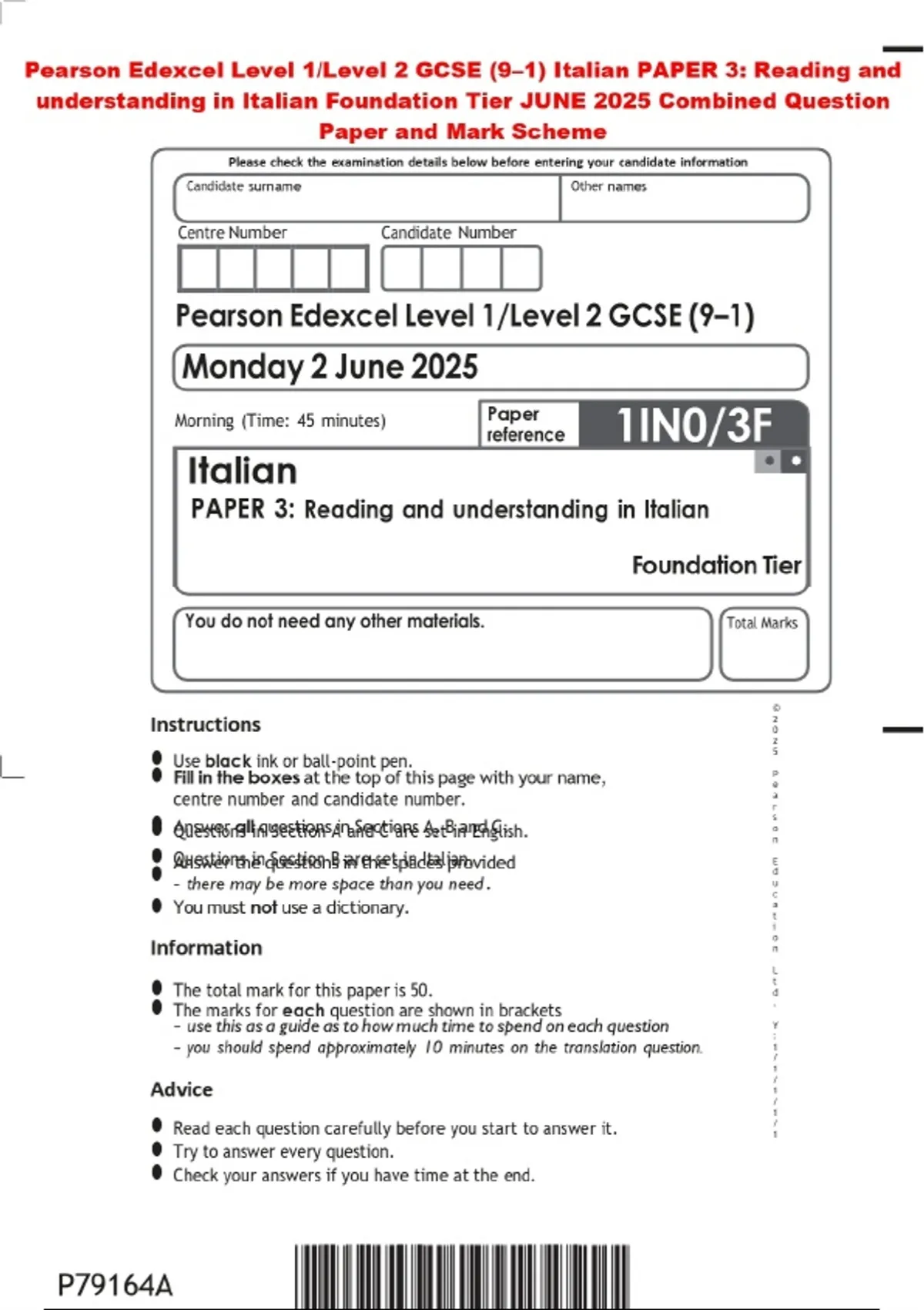 Pearson Edexcel Level 1/Level 2 GCSE (9–1) Italian PAPER 3: Reading and understanding in Italian Foundation Tier JUNE 2025 Combined Question Paper and Mark Scheme