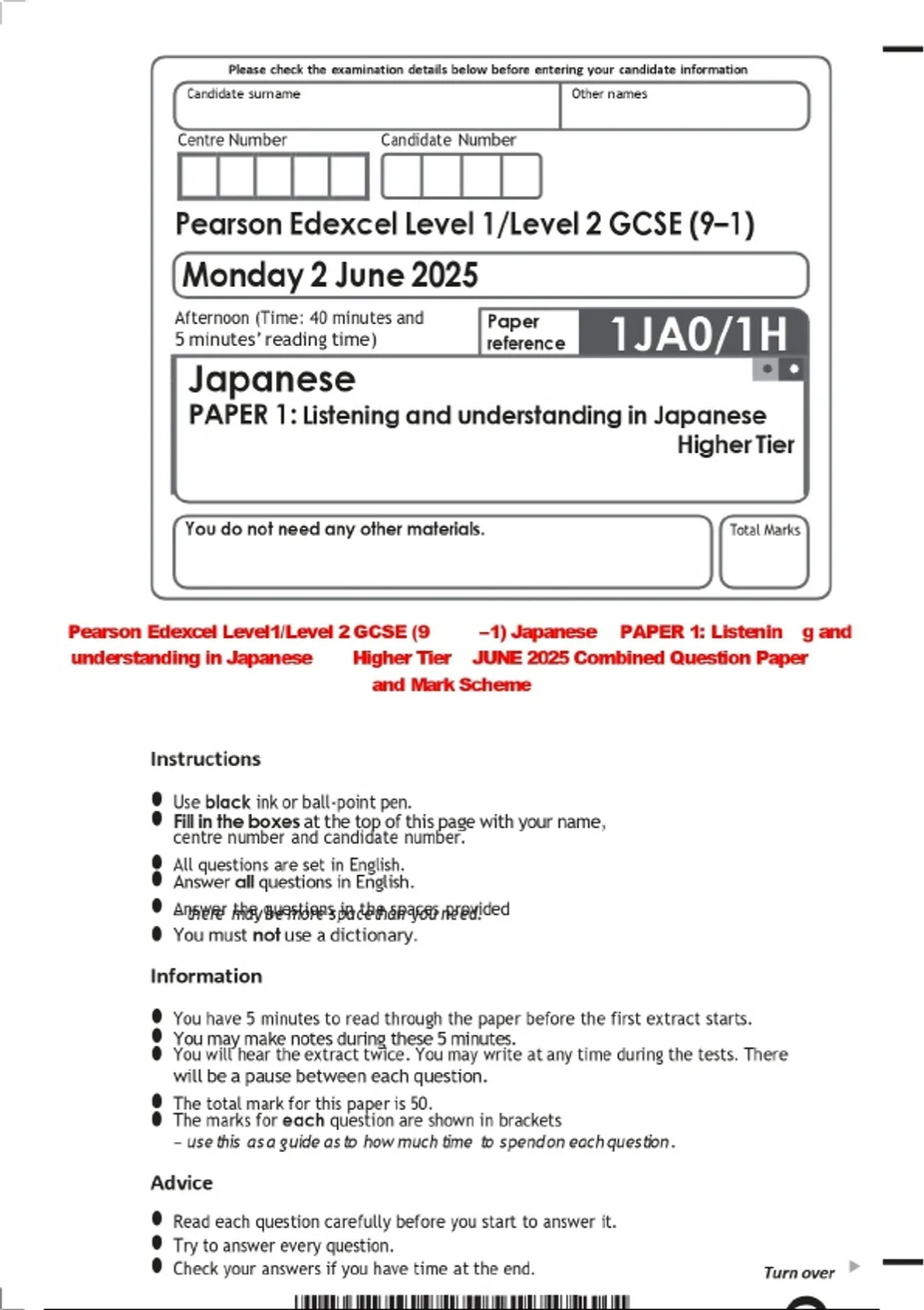 Pearson Edexcel Level1/Level 2 GCSE (9 understanding in Japanese Higher Tier † 1) Japanese PAPER 1: Listenin JUNE 2025 Combined Question Paper and Mark Scheme
