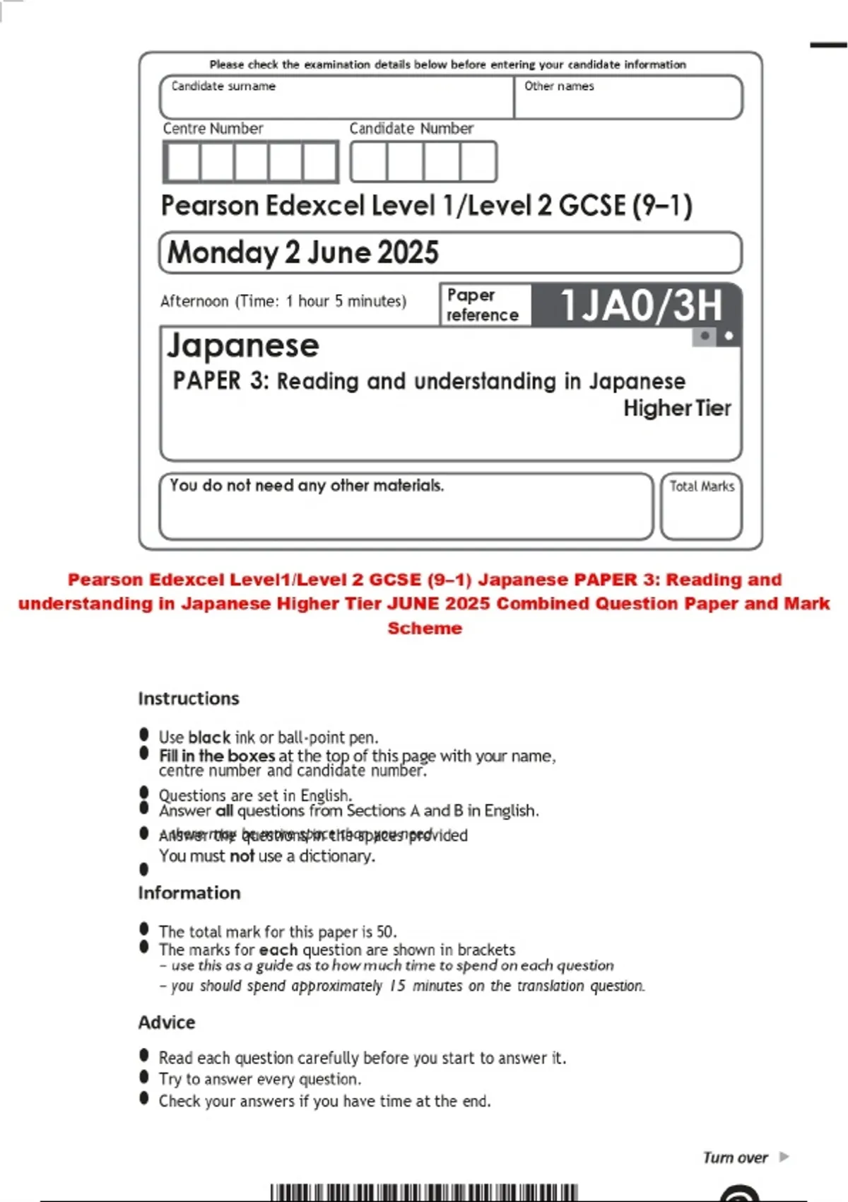Pearson Edexcel Level1/Level 2 GCSE (9–1) Japanese PAPER 3: Reading and understanding in Japanese Higher Tier JUNE 2025 Combined Question Paper and Mark Scheme