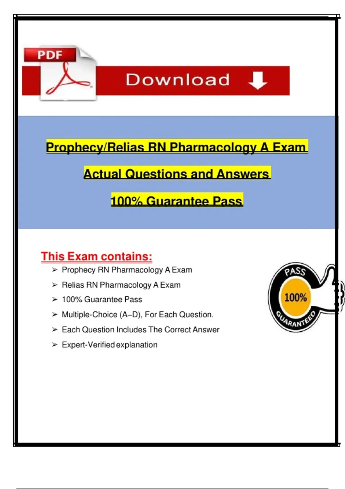 Download the Prophecy/Relias RN Pharmacology A Exam with actual questions, verified answers, and expert explanations. Prepare for your nursing pharmacology certification with 100% pass assurance.
