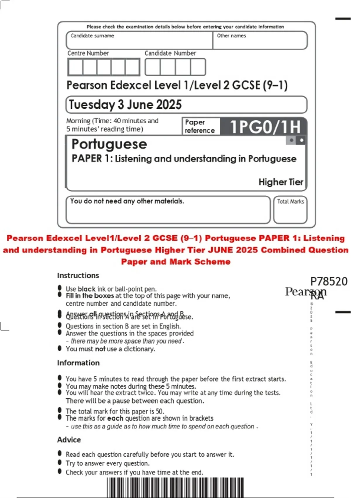 Pearson Edexcel Level1/Level 2 GCSE (9–1) Portuguese PAPER 1: Listening and understanding in Portuguese Higher Tier JUNE 2025 Combined Question Paper and Mark Scheme