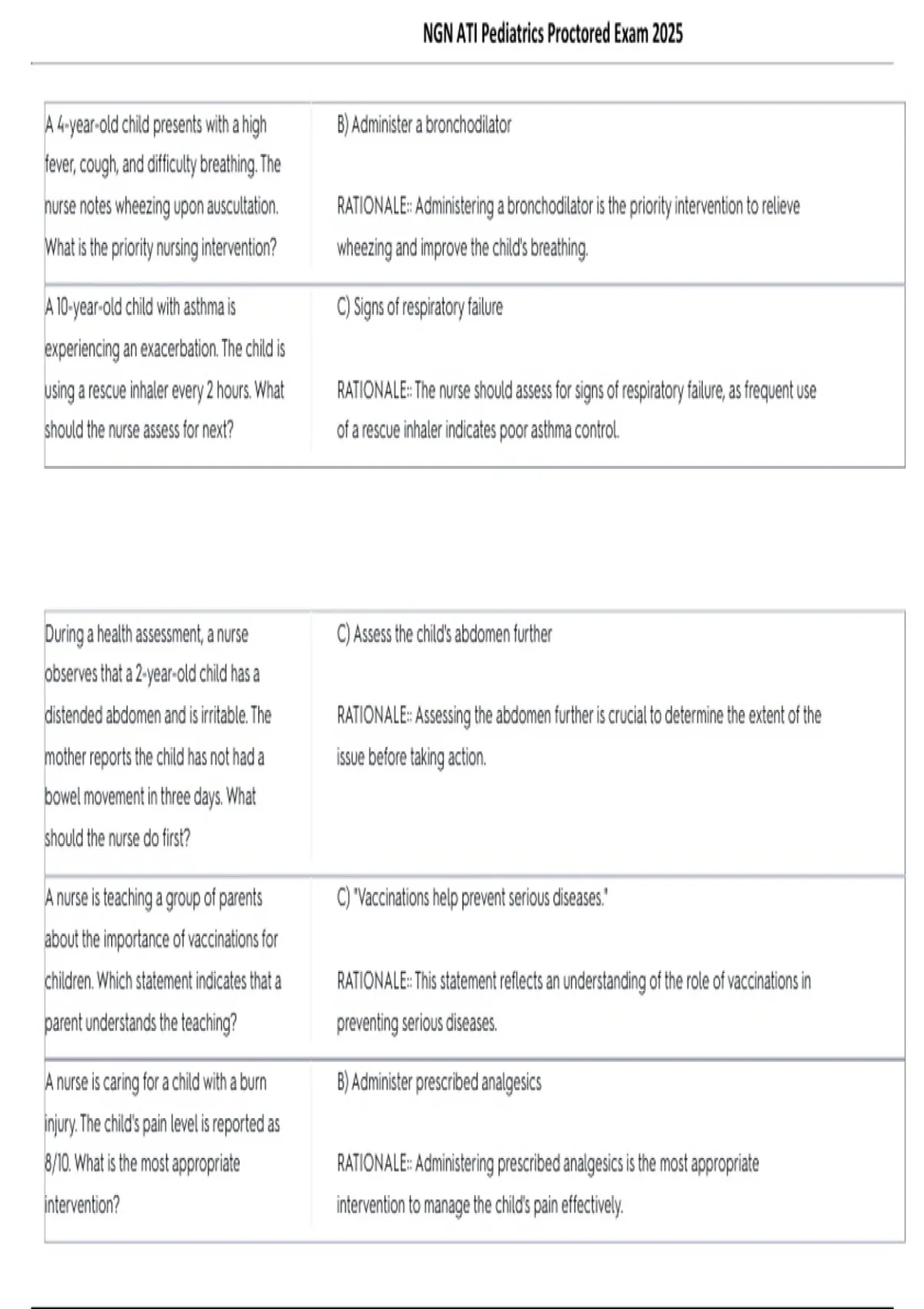 Comprehensive NGN ATI Pediatrics Proctored Exam study guide featuring full practice questions, verified answers, and detailed explanations. This resource helps nursing students review essential pediatric concepts, reinforce clinical reasoning, and prepare effectively for the ATI NGN proctored exam. A reliable exam preparation material with solution designed to boost confidence, improve performance, and ensure success in 2025/ 2026.