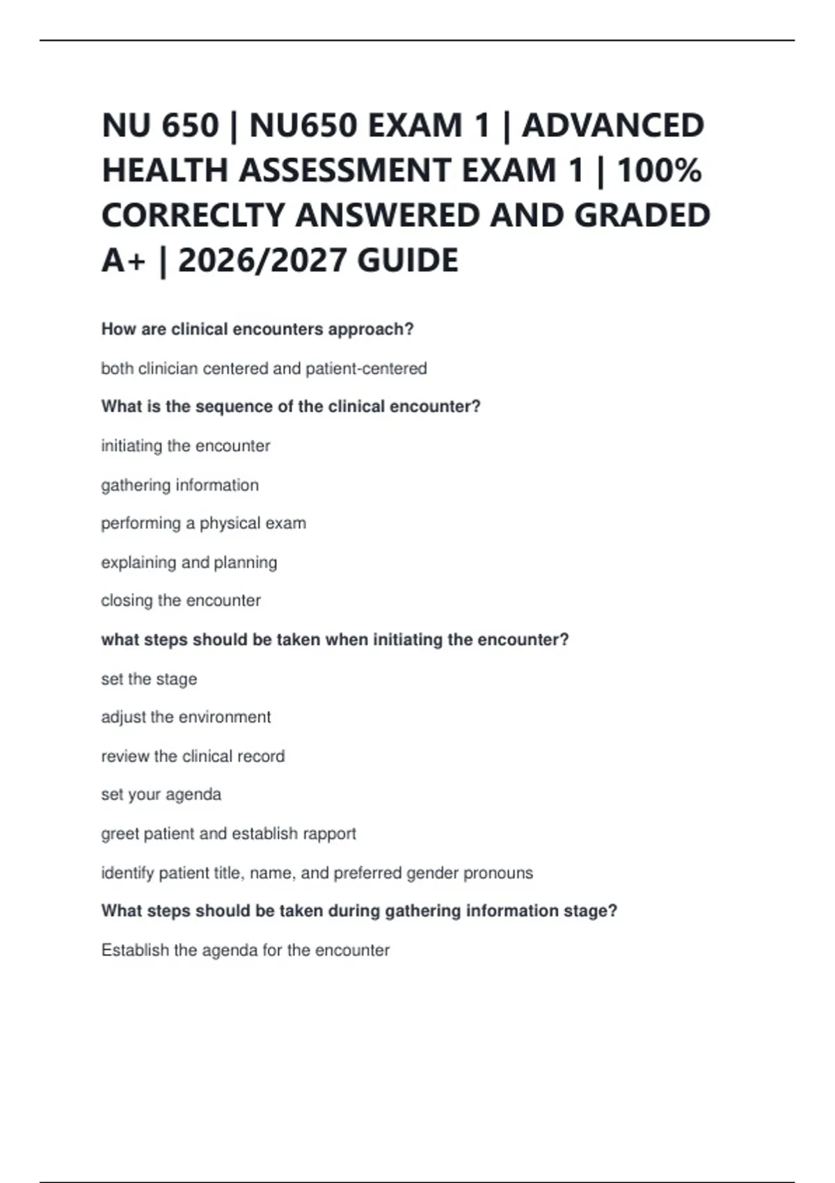 NU 650 | NU650 EXAM 1 | ADVANCED HEALTH ASSESSMENT EXAM 1 | 100% CORRECLTY ANSWERED AND GRADED A+ | 2026/2027 GUIDE