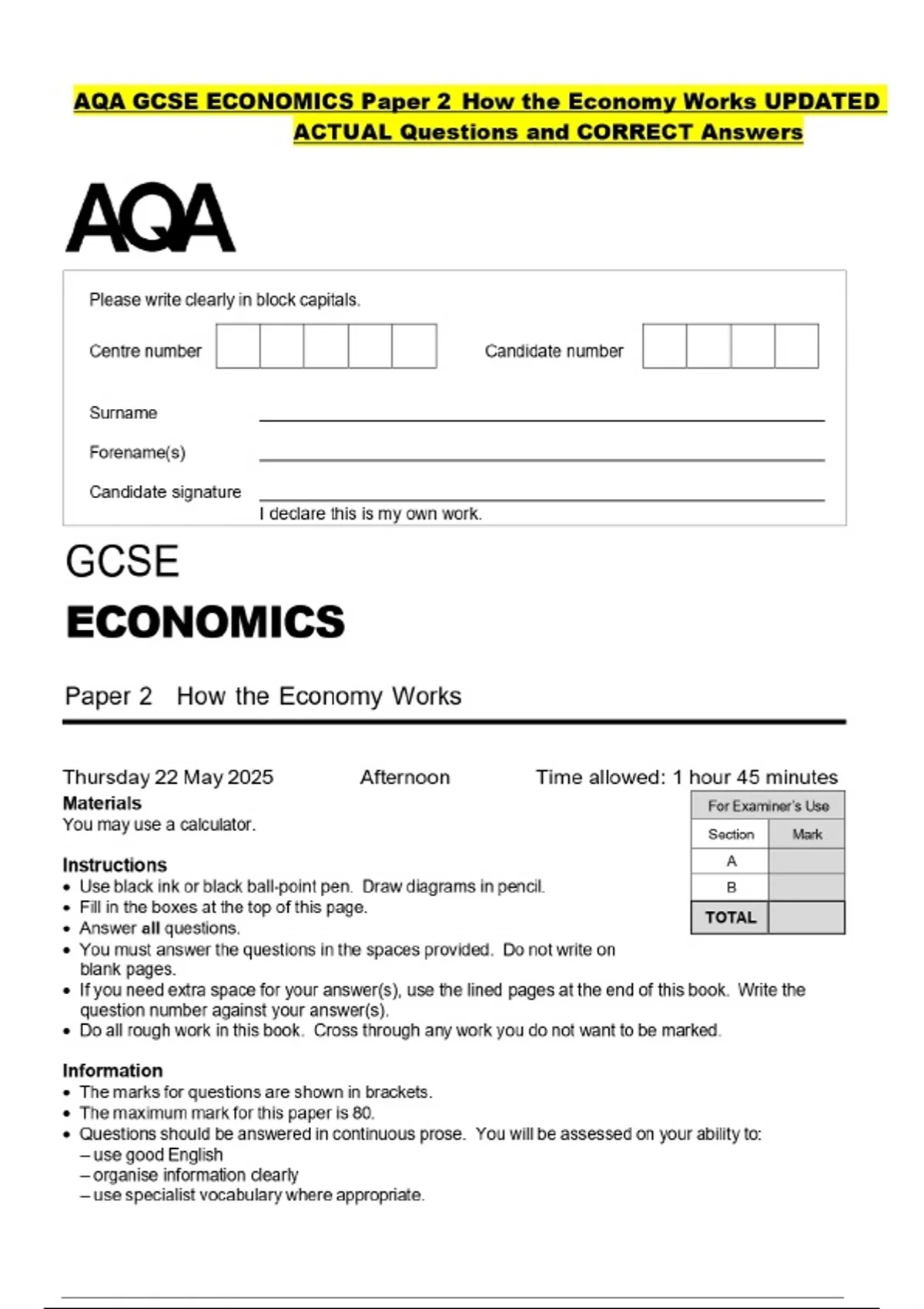 AQA GCSE ECONOMICS Paper 2 How the Economy Works UPDATED ACTUAL Questions and CORRECT Answers