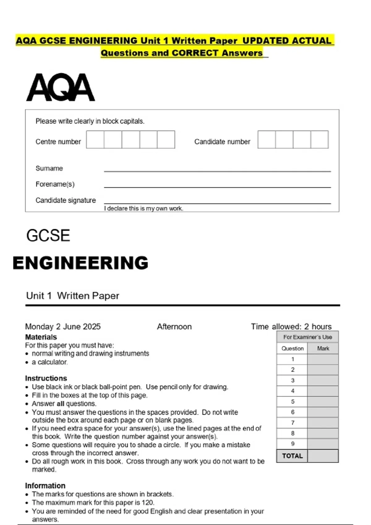 AQA GCSE ENGINEERING Unit 1 Written Paper UPDATED ACTUAL Questions and CORRECT Answers