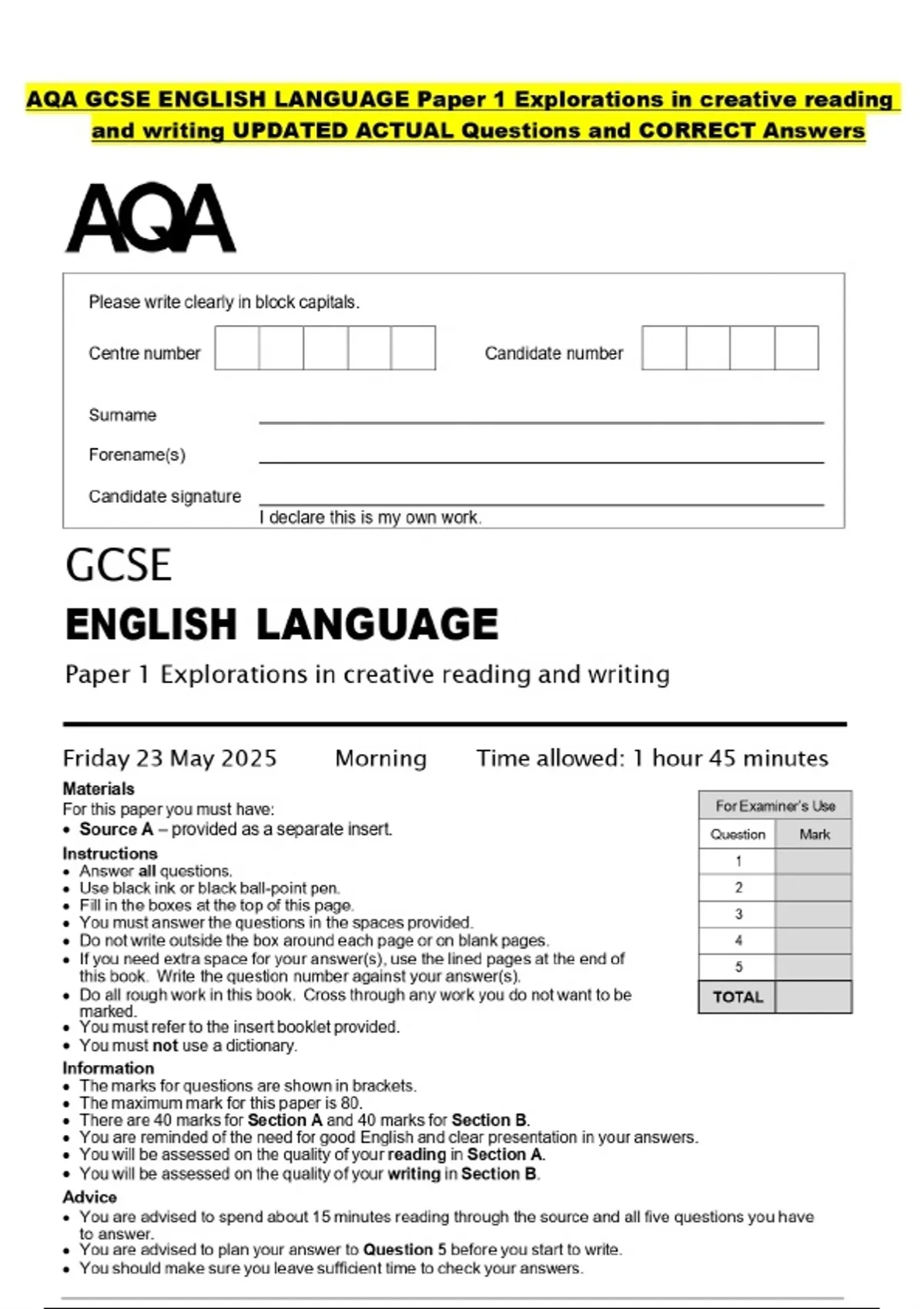 AQA GCSE ENGLISH LANGUAGE Paper 1 Explorations in creative reading and writing UPDATED ACTUAL Questions and CORRECT Answers