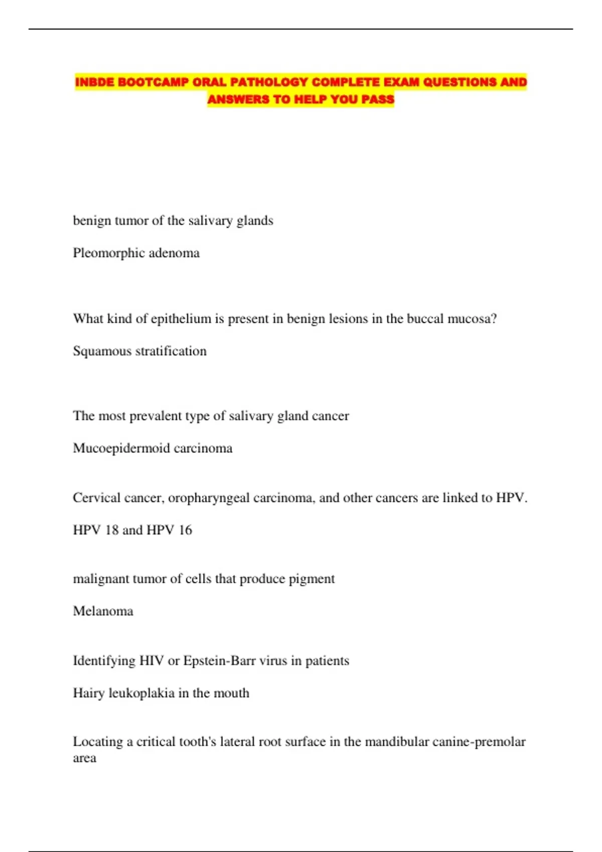 INBDE BOOTCAMP ORAL PATHOLOGY COMPLETE EXAM QUESTIONS AND ANSWERS TO HELP YOU PASS....