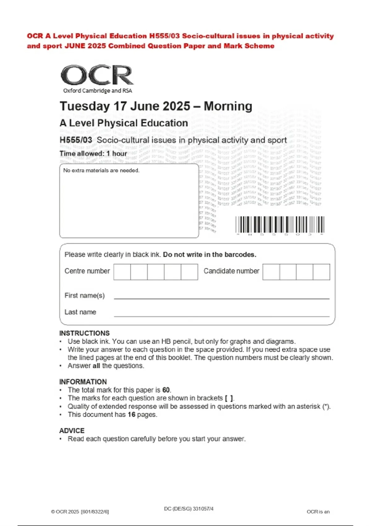 OCR A Level Physical Education H555/03 Socio-cultural issues in physical activity and sport JUNE 2025 Combined Question Paper and Mark Scheme