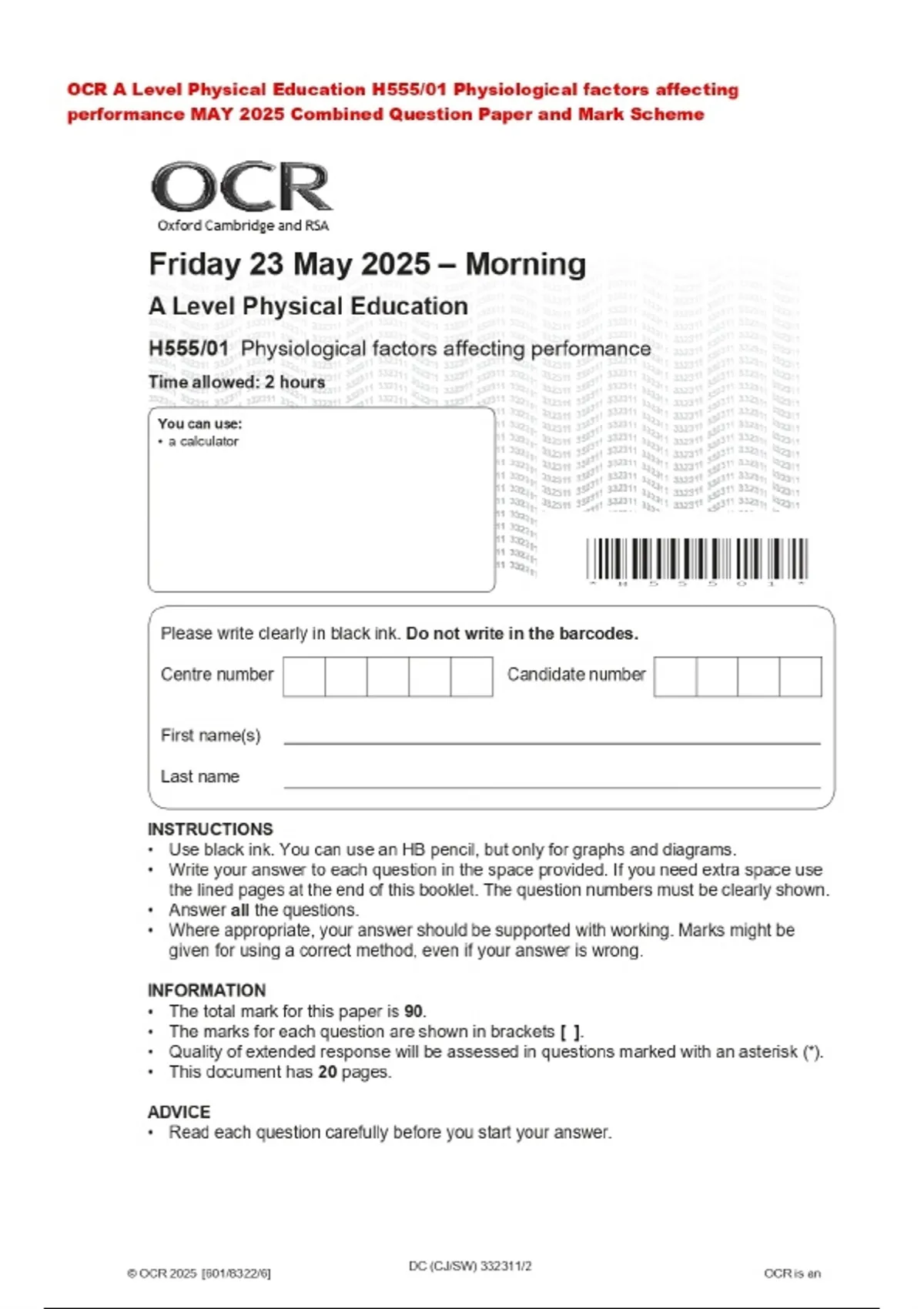 OCR A Level Physical Education H555/01 Physiological factors affecting performance MAY 2025 Combined Question Paper and Mark Scheme