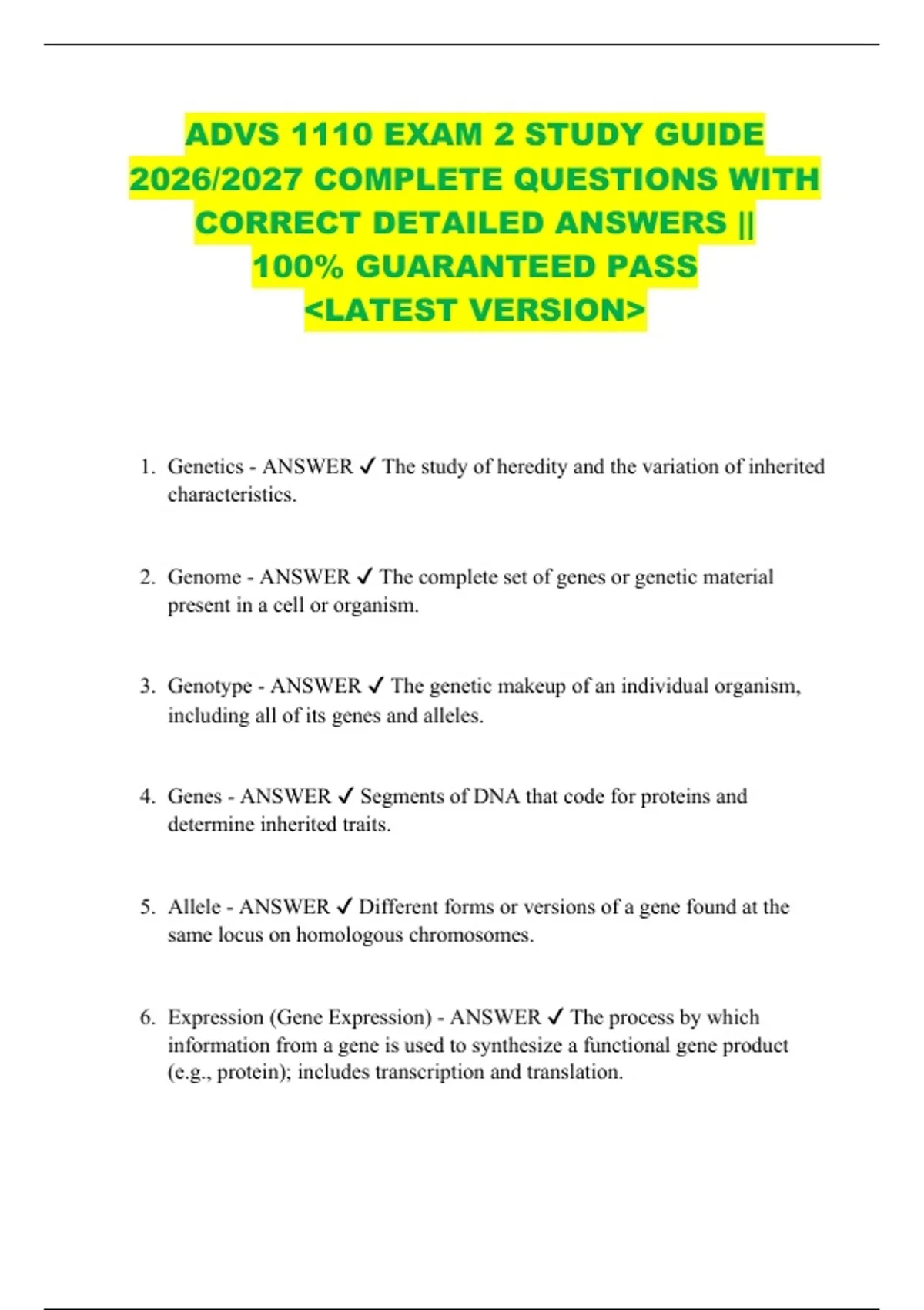 ADVS 1110 EXAM 2 STUDY GUIDE 2026/2027 COMPLETE QUESTIONS WITH CORRECT DETAILED ANSWERS || 100% GUARANTEED PASS &lt;LATEST VERSION&gt; 1. Genetics - ANSWER The study of heredity and the variation of inherited characteristics. 2. Genome - ANSWER The complete set of genes or genetic material present in a cell or organism. 3. Genotype - ANSWER The genetic makeup of an individual organism, including all of its genes and alleles. 4. Genes - ANSWER Segments of DNA that code for proteins and determine inherited traits. 5. Allele - ANSWER Different forms or versions of a gene found at the same locus on homologous chromosomes. 6. Expression (Gene Expression) - ANSWER The process by which information from a gene is used to synthesize a functional gene product (e.g., protein); includes transcription and translation. 7. Animal Breeding - ANSWER The selective mating of animals to increase the occurrence of desirable genetic traits in offspring. 8. Chromosomes - ANSWER Thread-like structures of DNA and protein that carry genetic information in the form of genes. 9. DNA (Deoxyribonucleic Acid) - ANSWER The molecule that carries genetic instructions used in growth, development, functioning, and reproduction of organisms. 10. Transcription - ANSWER The process in which a segment of DNA is copied into mRNA by the enzyme RNA polymerase. 11. true or false: one of the specific functions of the ovary is to produce the hormone Insulin, which is an important reproductive hormone - ANSWER false 12. the picture below depicts which of the following ovarian structures'? - ANSWER Tertiary/ graafian follicle 13. match the following anatomical features of the ovary with the destructive term that best matches that structure - ANSWER corpus hemorrhagic= bloody body corpus luteum= yellow body corpus allicins = fading remnant of corpus luteum 14. True or false - the more complex an organism is, the more chromosomes it will have - ANSWER False 15. Please match the following species with the diploid 2N number of chromosomes found in that species. Diploid 2N- Humans- Cattle- Dogs- Chickens- Pigs- Horses- - ANSWER Humans - 23 Cattle - 30 Dogs - 39 Chickens - 39 Pigs - 19 Horses - 32 16. Identify all characteristics associated with meiosis- - ANSWER only seen in gametes, "crossing over", introduces genetic variation, reduction division to reduce the number of chromosomes in a cell by half (to 1n), has prophase, anaphase, metaphase, and telophase 17. True or false - Most birds and reptiles use the same XX/XY chromosome based system for sex determination that mammals do - ANSWER False 18. Fill in the blanks to complete the following sentences - ____ is the degree to which a particular gene or set of genes, influences an animal ____ is one member of a gene pair (allele) that is expressed to exclusion of another allele _____ is the member of a gene pair that is only expressed when the dominant allele is absent from the genome - ANSWER gene expression, a dominant allele, a recessive allele 19. _____ is an example of a sex-linked recessive trait in humans - ANSWER Red/green colorblindness 20. ____ is the allele frequency of the dominant allele in the population - ANSWER 0.5 21. Match h^2 values to heritability- reproductive traits (generally) - Weaning Weight (h^2 =0.3) - Carcass characteristics (generally) - Meat tenderness (h^2=0.5) - Growth traits (generally) - Calving interval (h^2 = 0.1) - - ANSWER reproductive traits (generally) - LOW Weaning Weight (h^2 =0.3) - MODERATE Carcass characteristics (generally) - HIGH Meat tenderness (h^2=0.5) - HIGH Growth traits (generally) - MODERATE Calving interval (h^2 = 0.1) - LOW 22. Match breeding/mating systems with definition- Inbreeding - Outcrossing - Crossbreeding - - ANSWER Inbreeding - mating related animals Outcrossing - mating unrelated animals from same breed Crossbreeding - mating animals from different breeds 23. The atlas blue butterfly has ____ chromosome pairs - ANSWER 229 24. Females of the muntjac species have ____ chromosomes - ANSWER 12