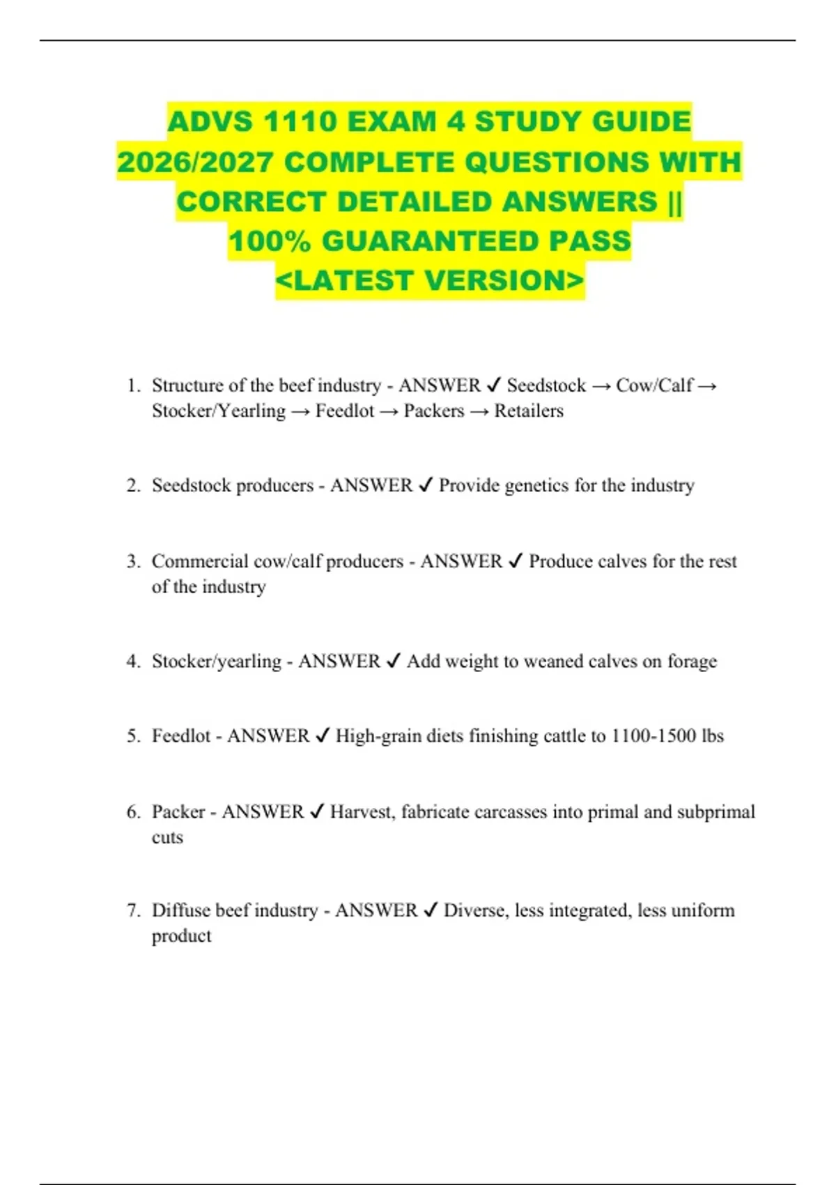 ADVS 1110 EXAM 4 STUDY GUIDE 2026/2027 COMPLETE QUESTIONS WITH CORRECT DETAILED ANSWERS || 100% GUARANTEED PASS &lt;LATEST VERSION&gt; 1. Structure of the beef industry - ANSWER Seedstock → Cow/Calf → Stocker/Yearling → Feedlot → Packers → Retailers 2. Seedstock producers - ANSWER Provide genetics for the industry 3. Commercial cow/calf producers - ANSWER Produce calves for the rest of the industry 4. Stocker/yearling - ANSWER Add weight to weaned calves on forage 5. Feedlot - ANSWER High-grain diets finishing cattle to lbs 6. Packer - ANSWER Harvest, fabricate carcasses into primal and subprimal cuts 7. Diffuse beef industry - ANSWER Diverse, less integrated, less uniform product 8. Integrated livestock industries - ANSWER Swine/poultry are highly efficient and coordinated 9. Pros of beef industry diversity - ANSWER Lower disease/wildfire risk, year-round supply 10. Cons of beef industry diversity - ANSWER Less uniform product, slower change, variable quality 11. Beef production trend - ANSWER Production rising due to heavier carcass weights 12. he has how many kids - ANSWER 5 13. is whale cheese a real thing - ANSWER no 14. What are the four parts of the beef production sector? - ANSWER Seedstock, Cow/Calf, Stocker/Yearling, Feedlot 15. What are the two parts of the beef processing sector? - ANSWER Packers and Retailers 16. Why is the beef industry considered 'diffuse and diverse'? - ANSWER Many small producers; not vertically integrated. 17. What is one pro and one con of beef being less integrated? - ANSWER Pro: flexibility; Con: slower adoption of tech/efficiency. 18. Where are most beef cows located? - ANSWER Great Plains & Midwest (Texas #1). 19. Who are the 'Big Four' meat packers? - ANSWER Tyson, Cargill, JBS, National Beef. 20. What is the difference between Bos taurus and Bos indicus? - ANSWER Taurus = cool climates; Indicus = heat tolerant. 21. Can you name an example of British breeds? - ANSWER Angus, Hereford, Shorthorn. 22. Can you name an example of Continental breeds? - ANSWER Charolais, Limousin, Simmental. 23. Can you name an example of an Indicine breed? - ANSWER Brahman. 24. What is BCS used for? - ANSWER Evaluating fatness; predicts reproductive success. 25. What is the gestation length of pigs? - ANSWER 114 days (3 mo, 3 wks, 3 days). 26. What is a boar? - ANSWER Intact male pig. 27. What is a barrow? - ANSWER Castrated male pig. 28. What is a sow? - ANSWER Female pig that has farrowed. 29. What is a gilt? - ANSWER Young female that hasn't farrowed. 30. When are gilts first bred? - ANSWER 7-8 months. 31. When is the first litter born? - ANSWER Around 1 year old. 32. What does it mean to farrow? - ANSWER To give birth. 33. What is the average litter size? - ANSWER 10-14. 34. Animal productivity is the direct result of two main components, they are: - ANSWER Genetics and Environment 35. Heritability is the term used to describe different production levels in animals that we can attribute to the environment, the rest of the difference we attribute to genetics. - ANSWER False 36. In animals, sperm and ovum are referred to as gametes and are diploid cells which is to say they have same genetic material as any other cell in the animals body. - ANSWER False 37. A herd consist of 125 black cows. 35 are sired by red Bulls and thus are heterozygous for hair color (Bb). No cows are red. what is the gene frequency for the black gene(B)____________? Gene frequencies are expressed as a percentage but don't put the percent sign just put a number. What is the gene frequency of the red gene_________? - ANSWER 86, 14