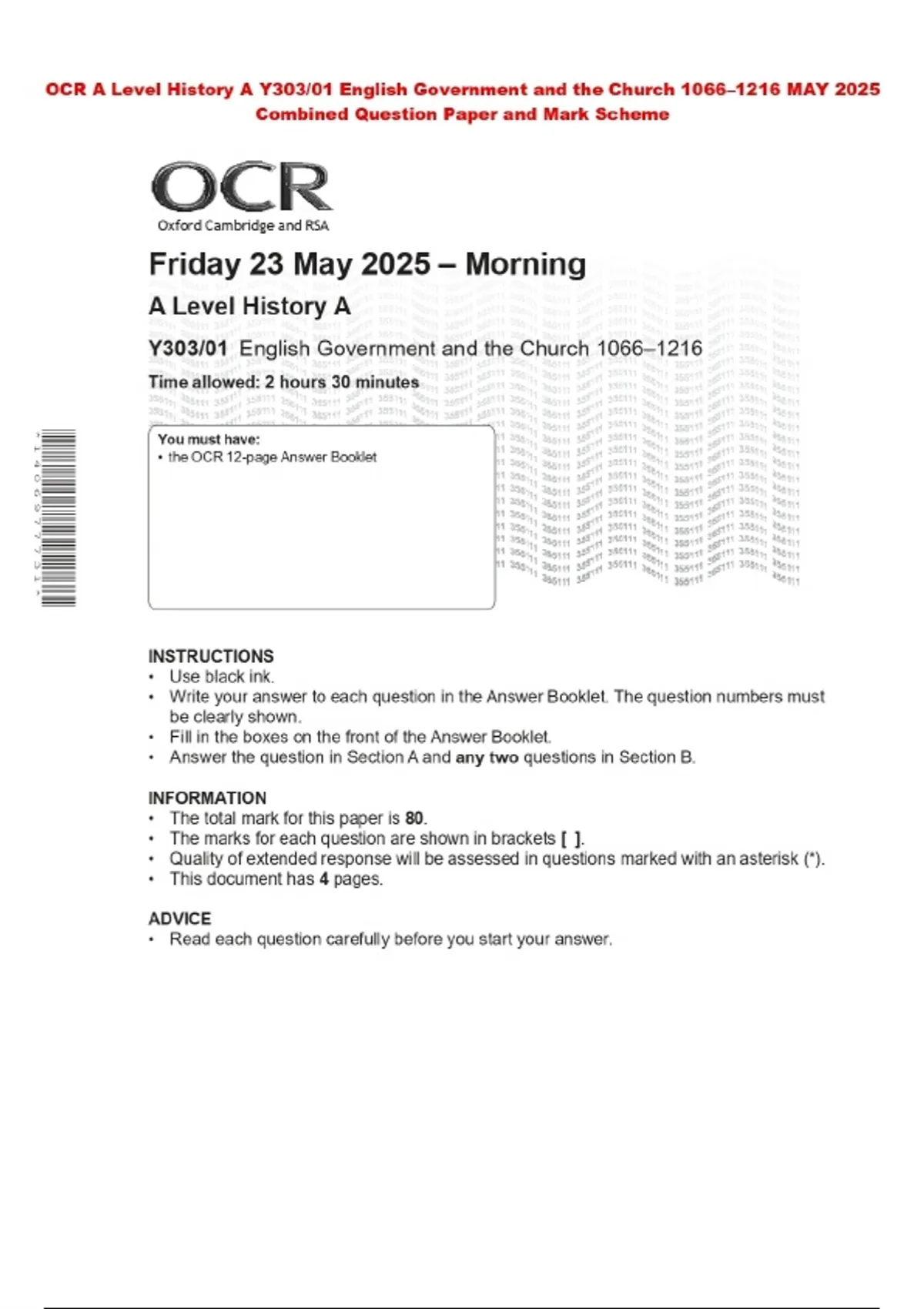 OCR A Level History A Y303/01 English Government and the Church 1066–1216 MAY 2025 Combined Question Paper and Mark Scheme