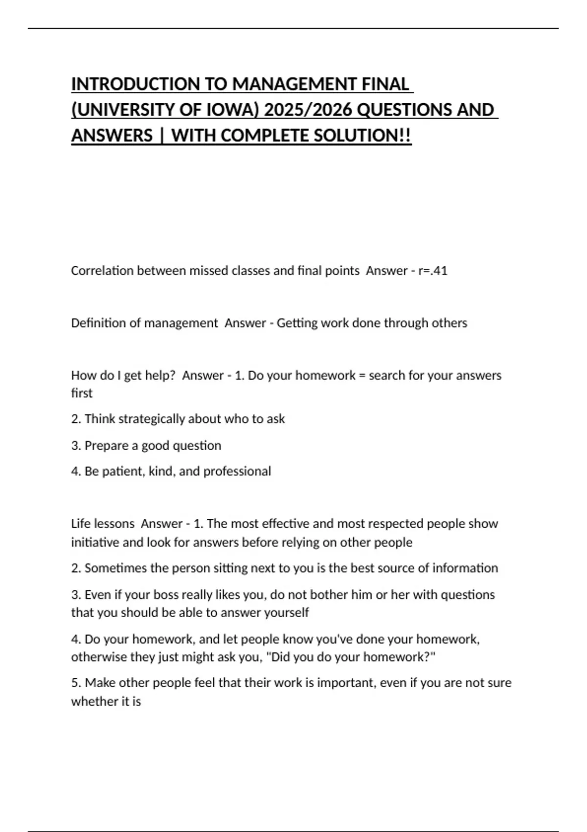 INTRODUCTION TO MANAGEMENT FINAL (UNIVERSITY OF IOWA) 2025/2026 QUESTIONS AND ANSWERS | WITH COMPLETE SOLUTION!!